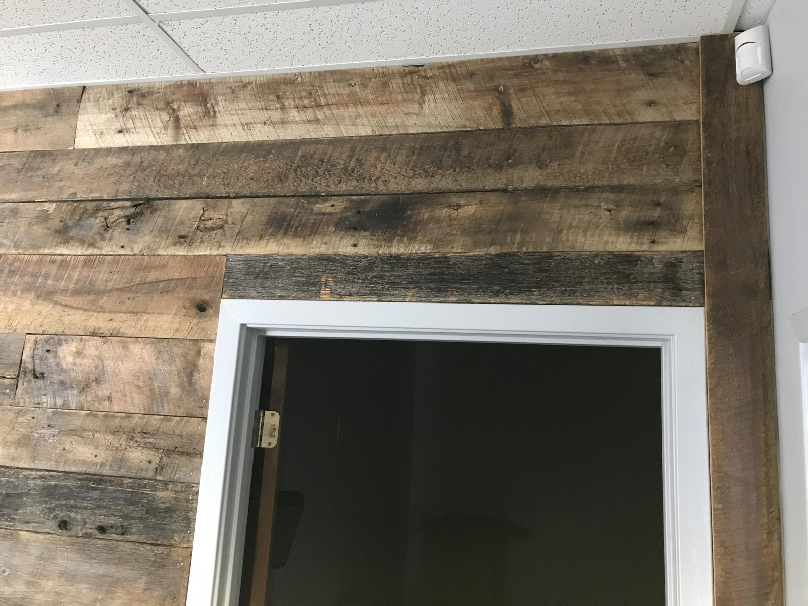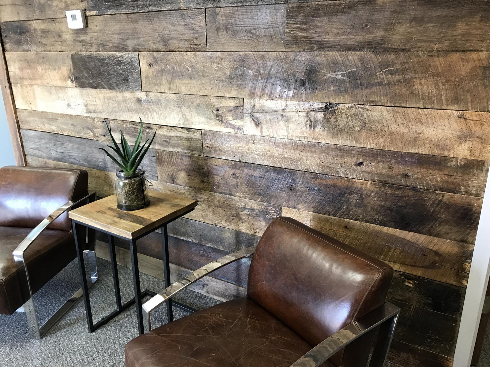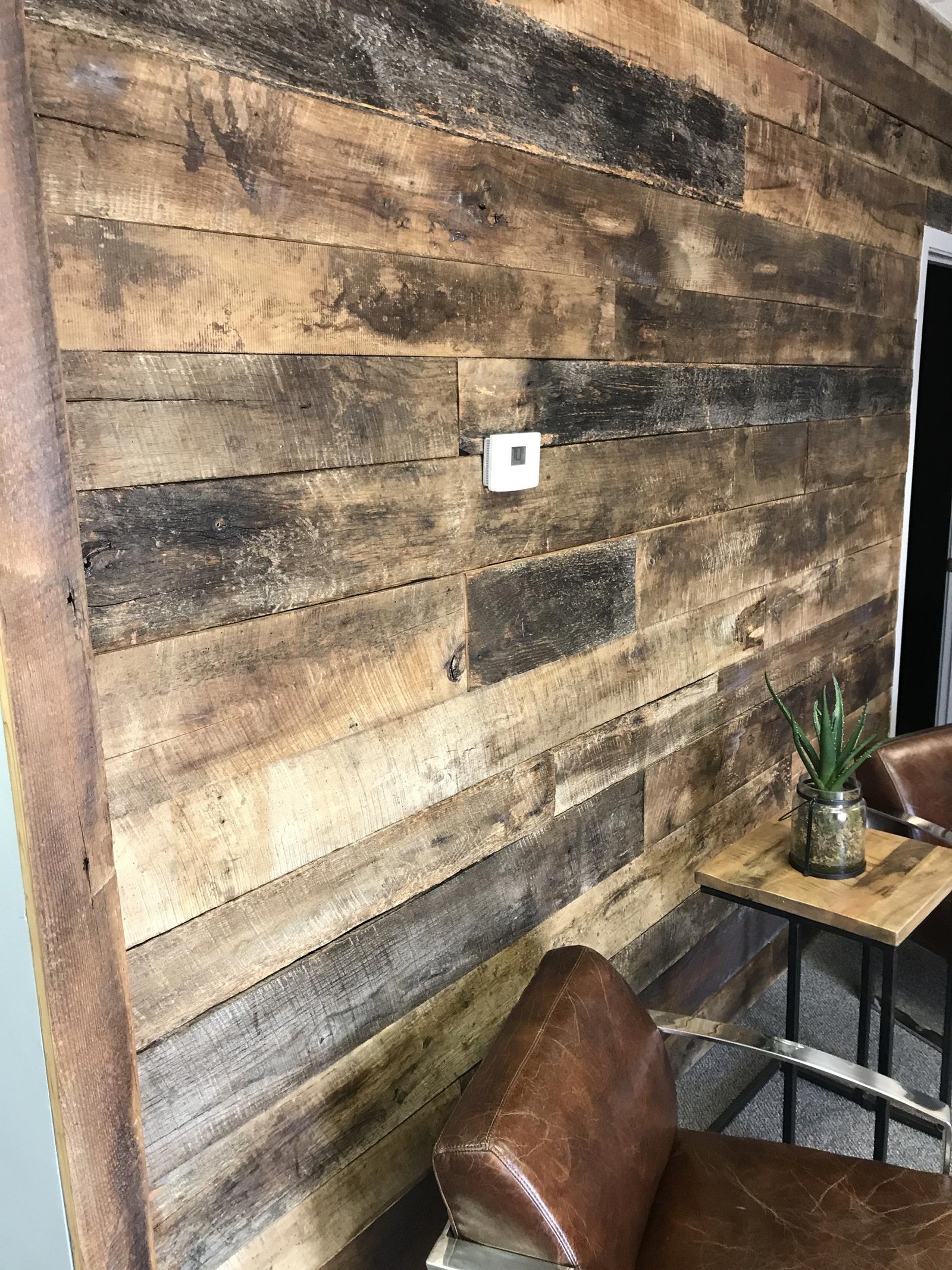Took a boring office lobby to the next level with this 90+ years old Barnwood.