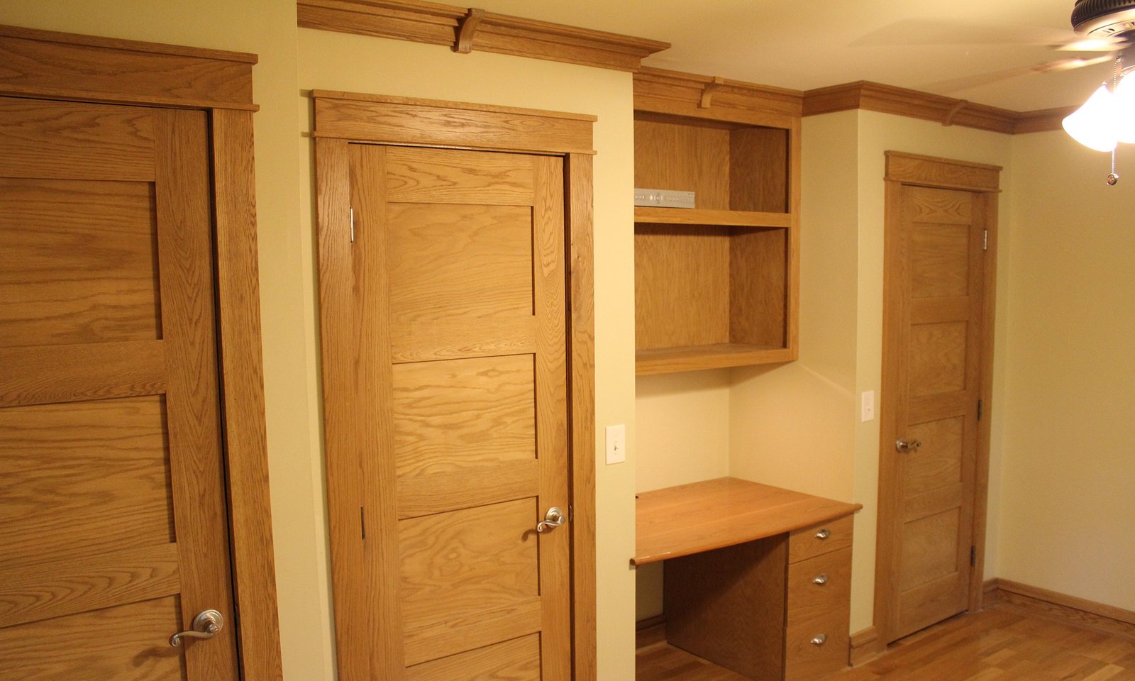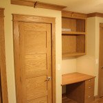 - Custom built white oak doors, crown moulding & built-in desk and entertainment center