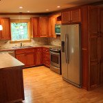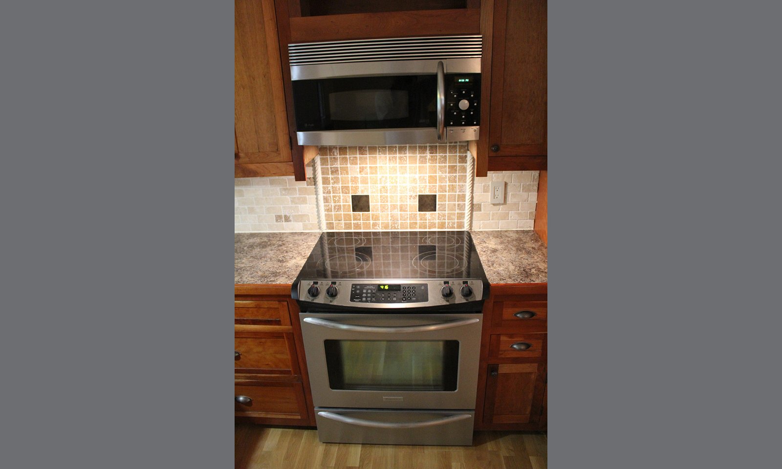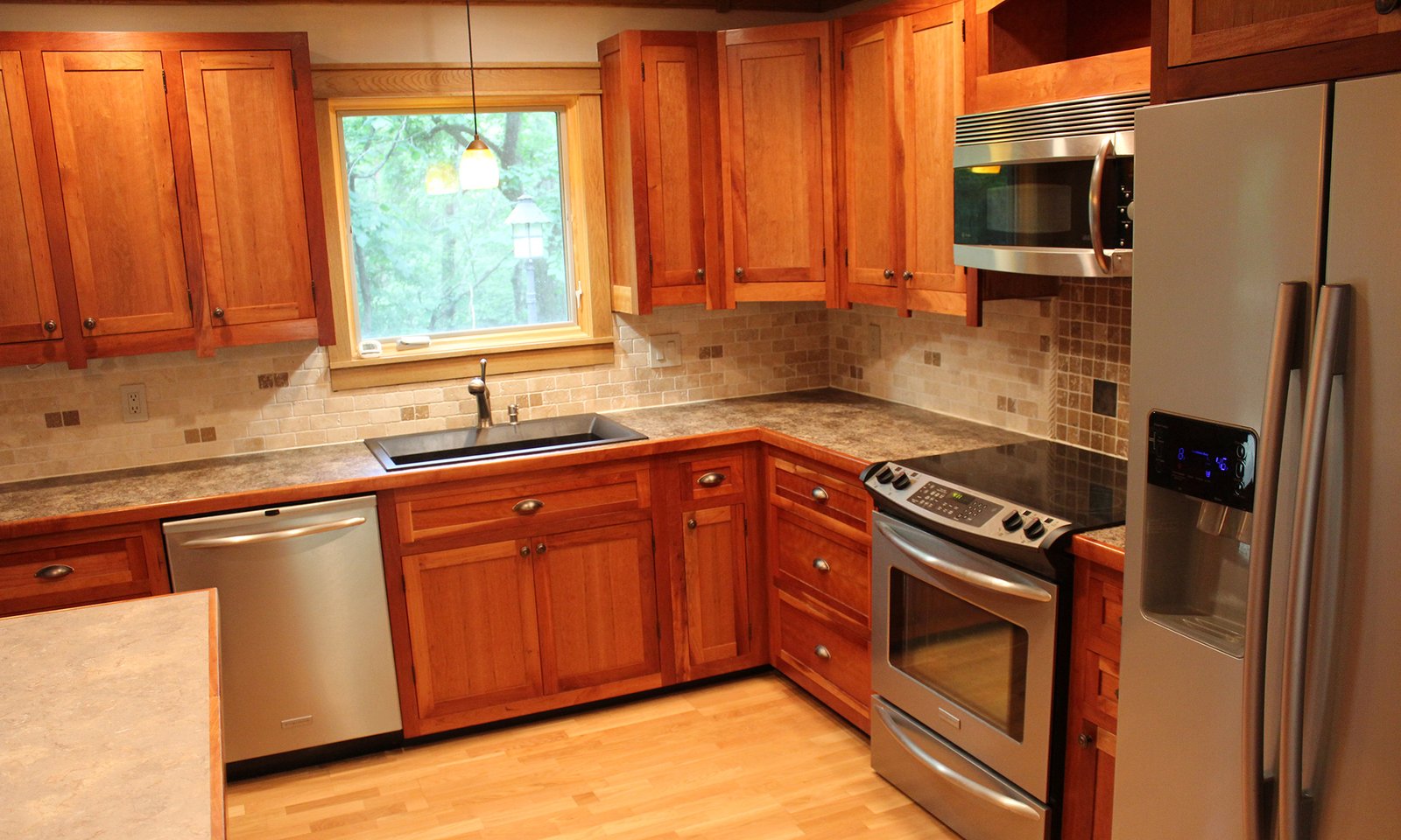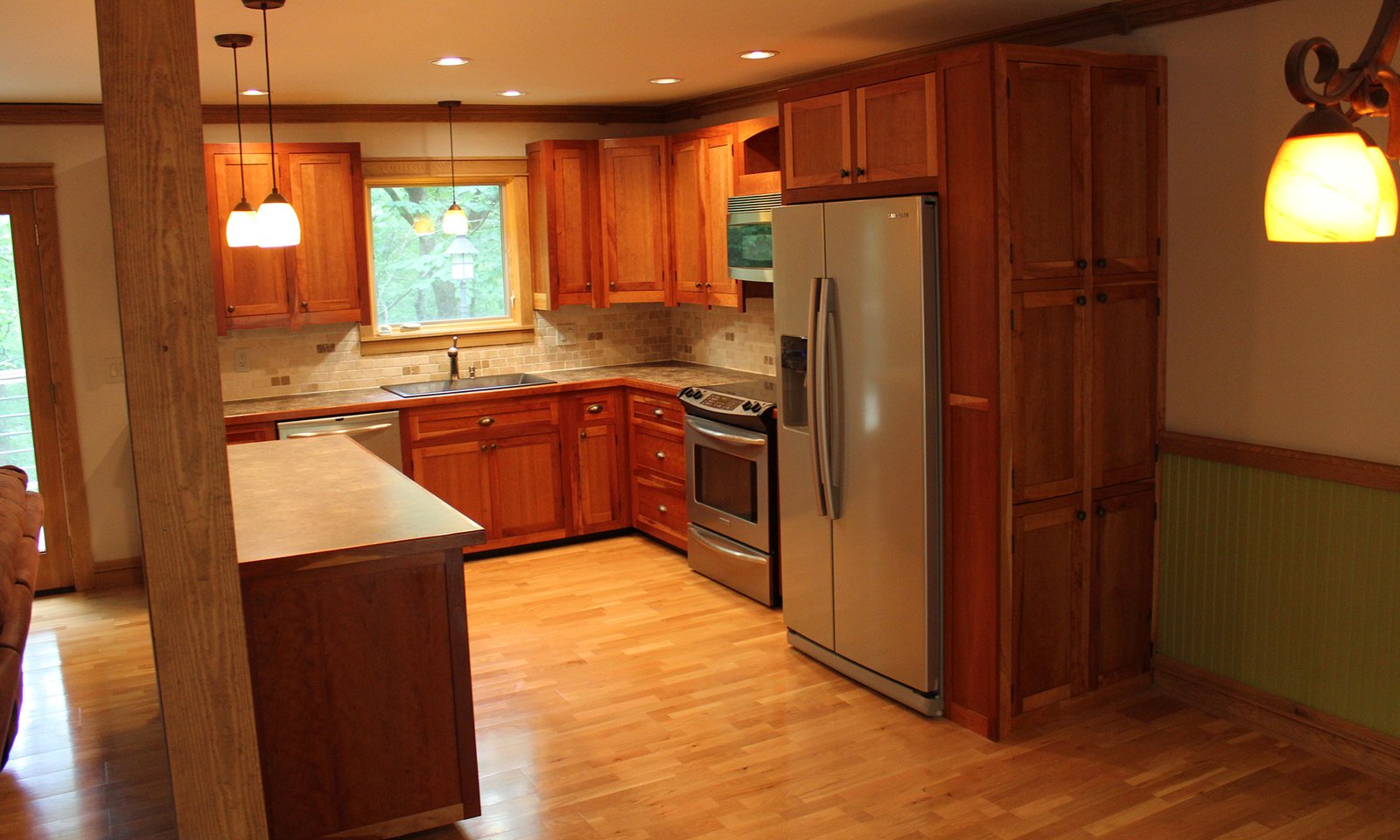- Custom built cherry cabinets, hardwood floor and lighting