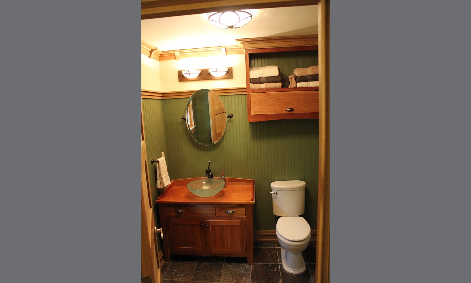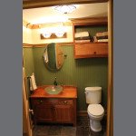 - Custom built cherry cabinets, wainscot walls with tile floor and shower surround