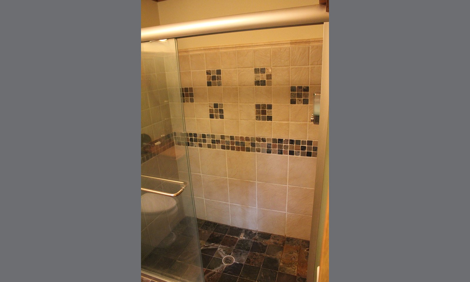 - Slate tile floors with accent tile walls, glass door and all new fixtures