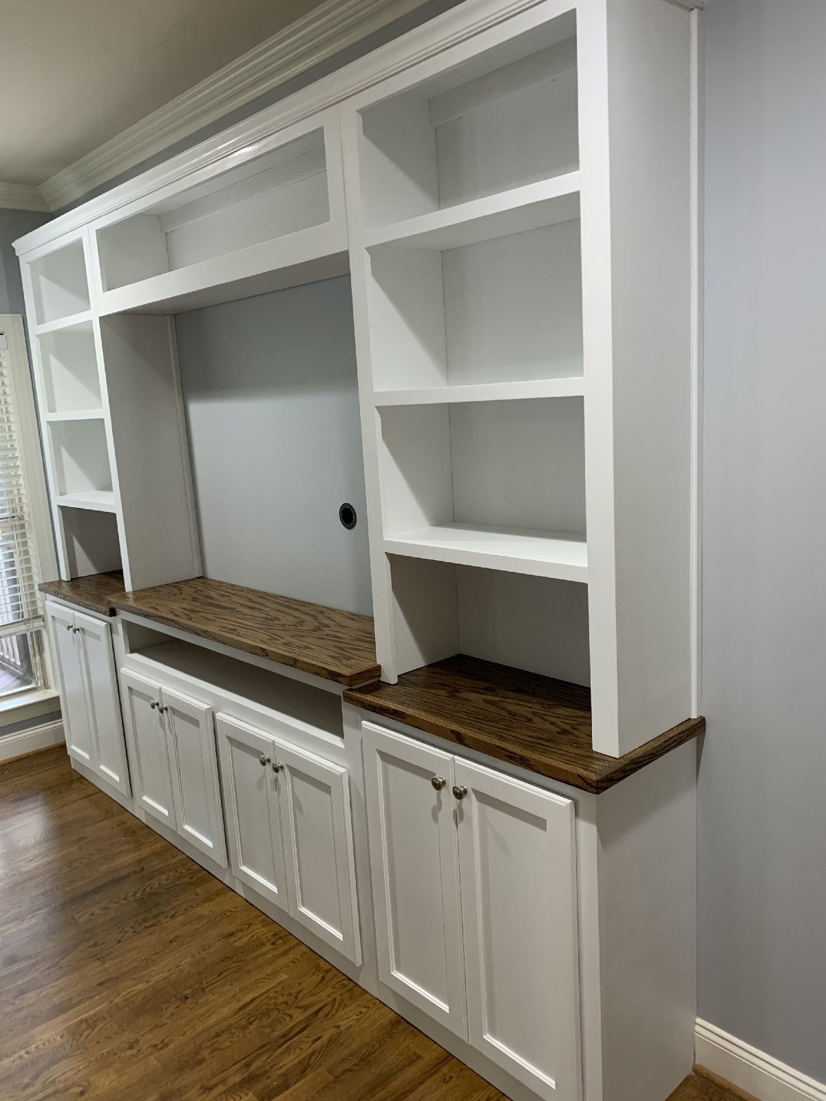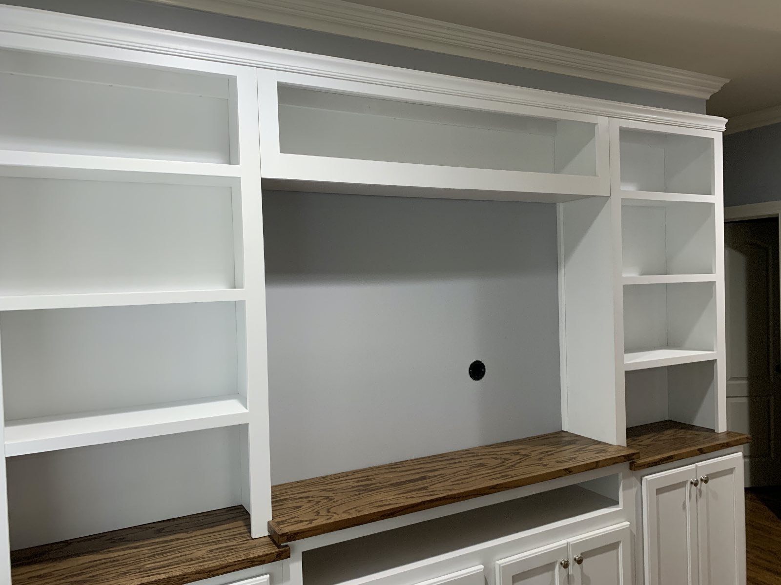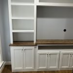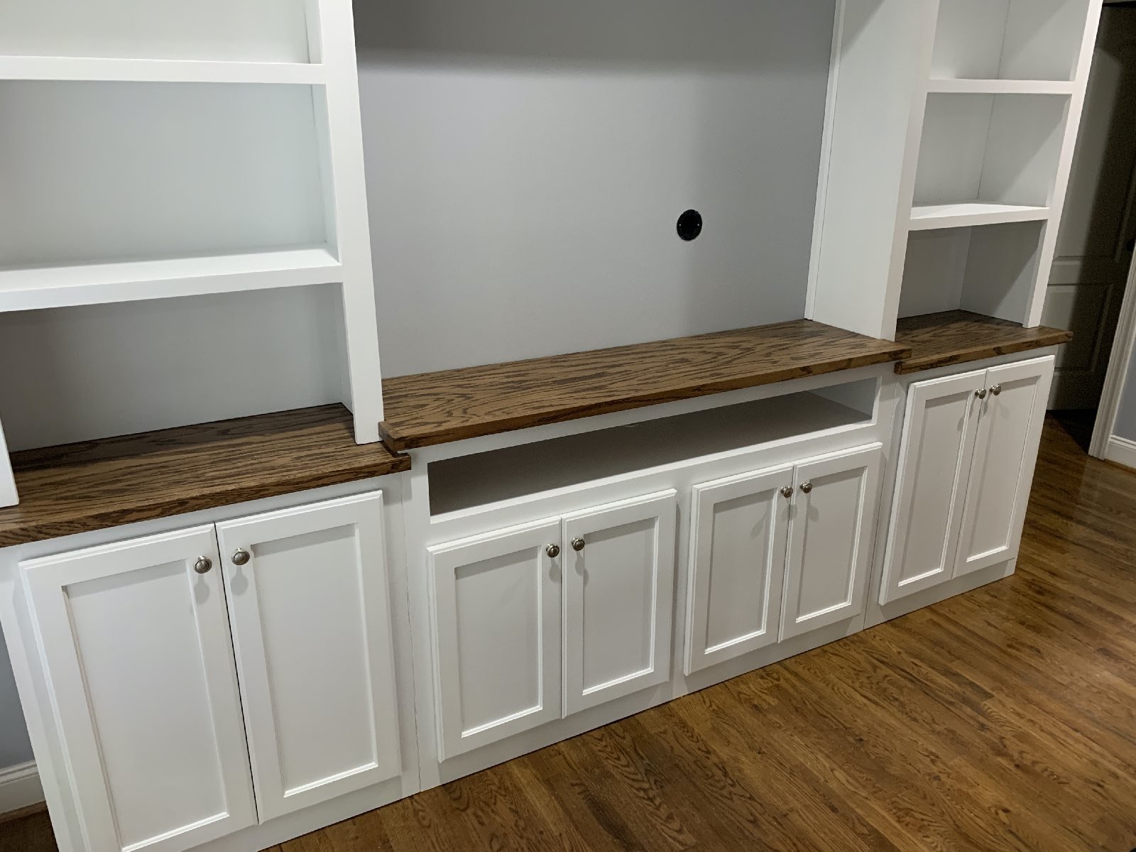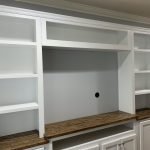 Custom Cabinetry for a new family’s living room. 10′ cabinetry & shelving with a bridge for a flat screen.