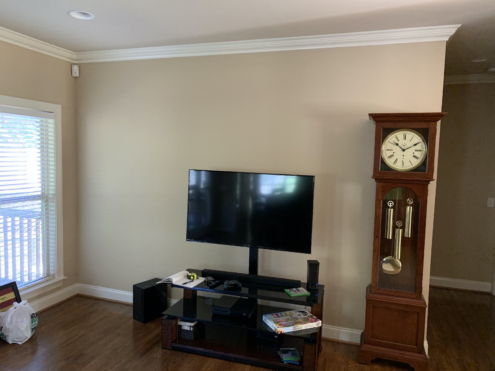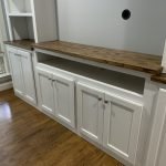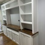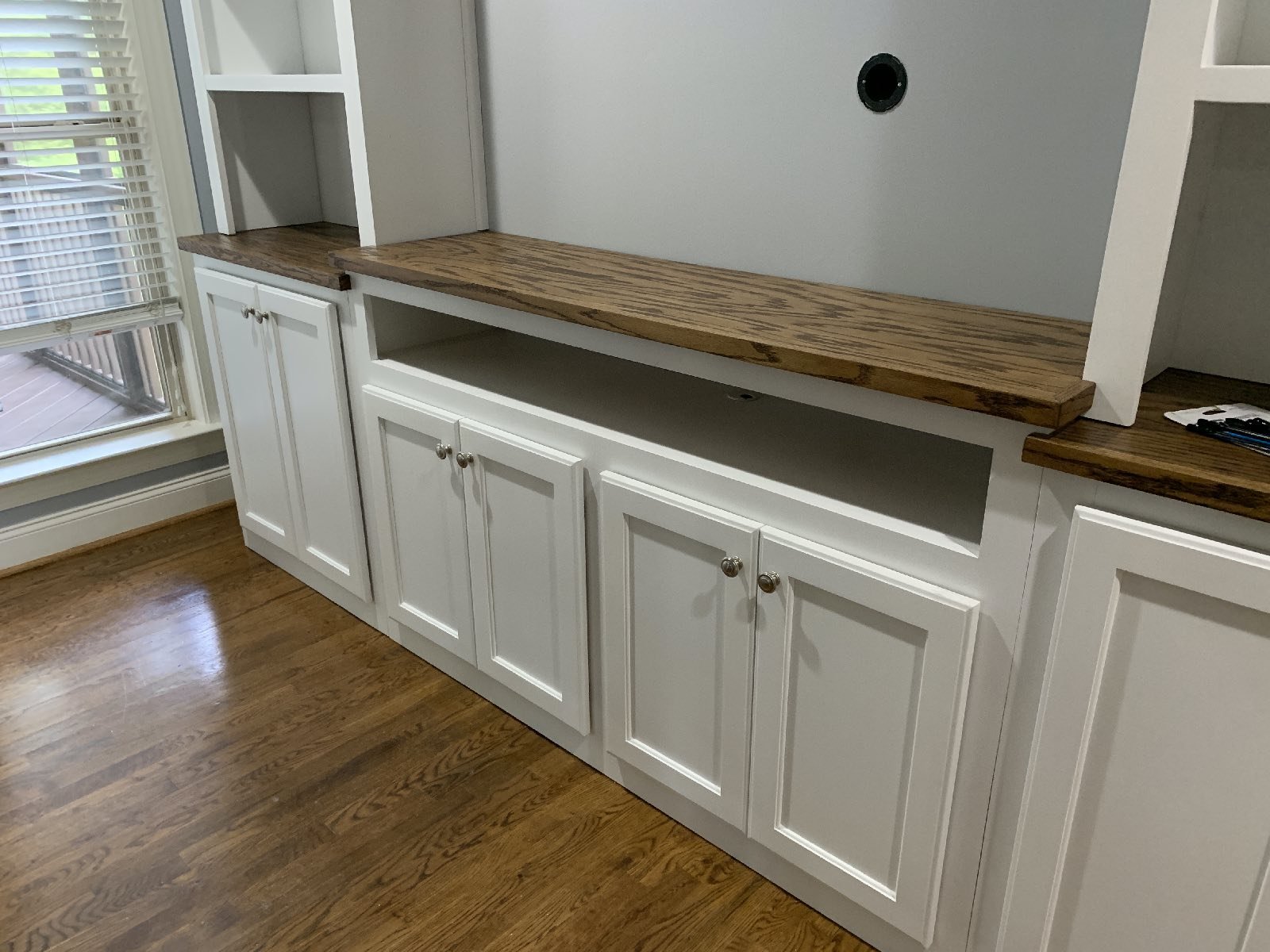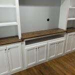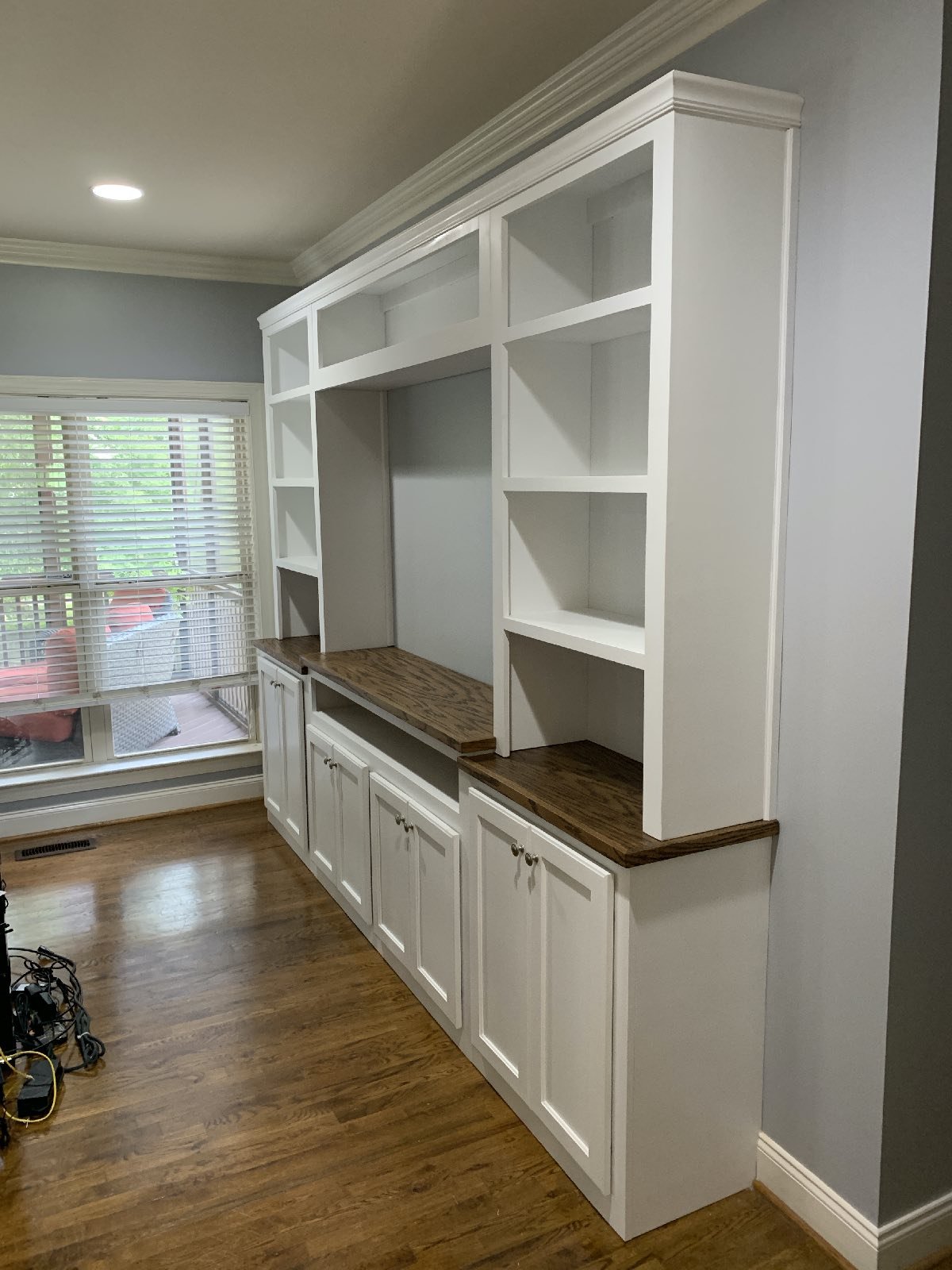 Custom Cabinetry for a new family’s living room. 10′ cabinetry & shelving with a bridge for a flat screen.