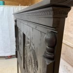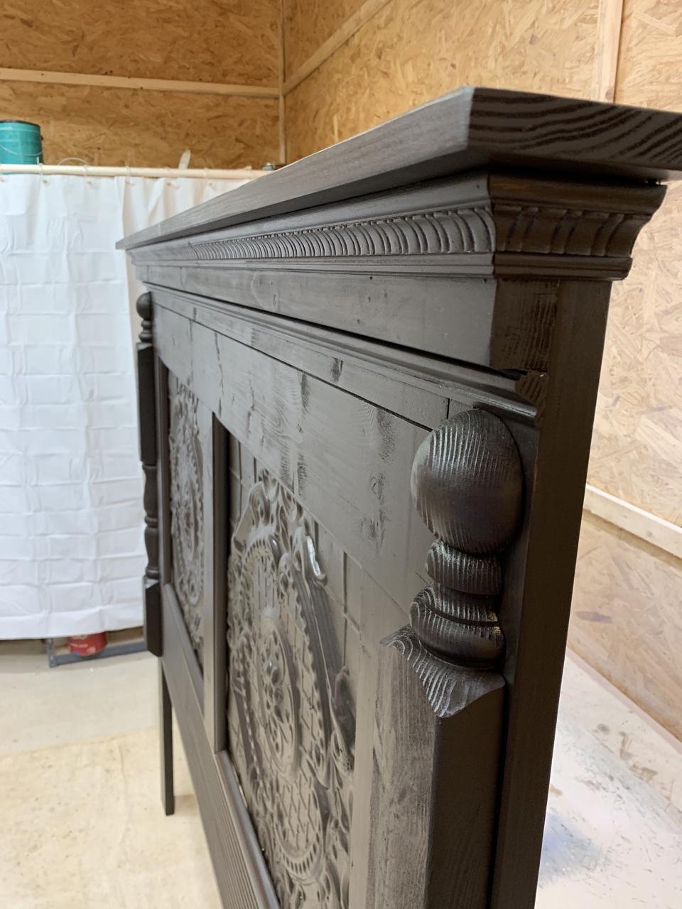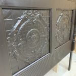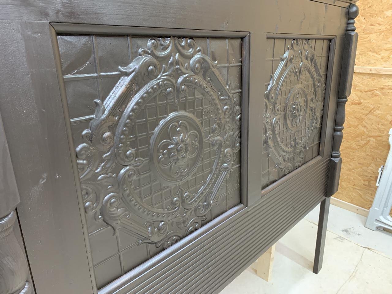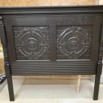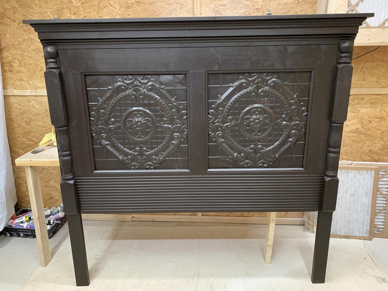 Custom Queen Headboard – hardwood with column and tin panel details in a Kona finish.