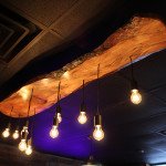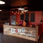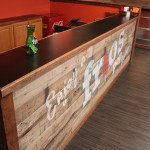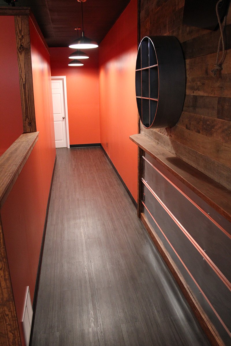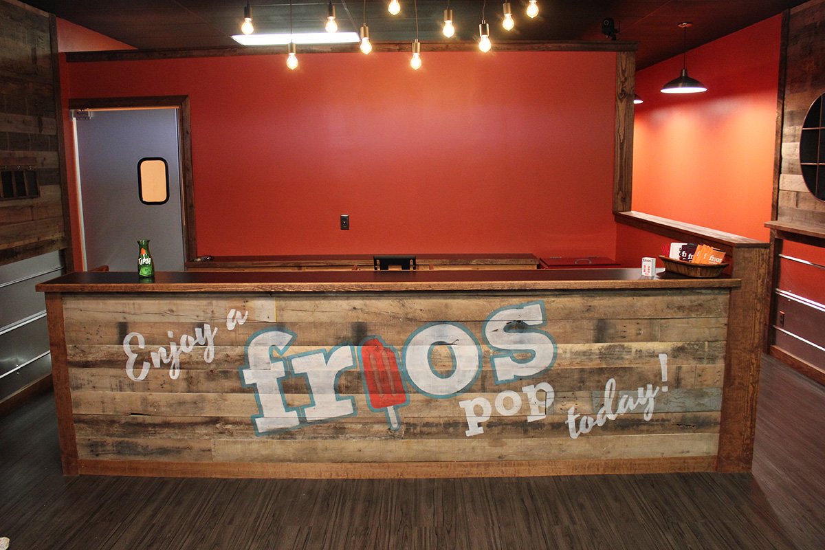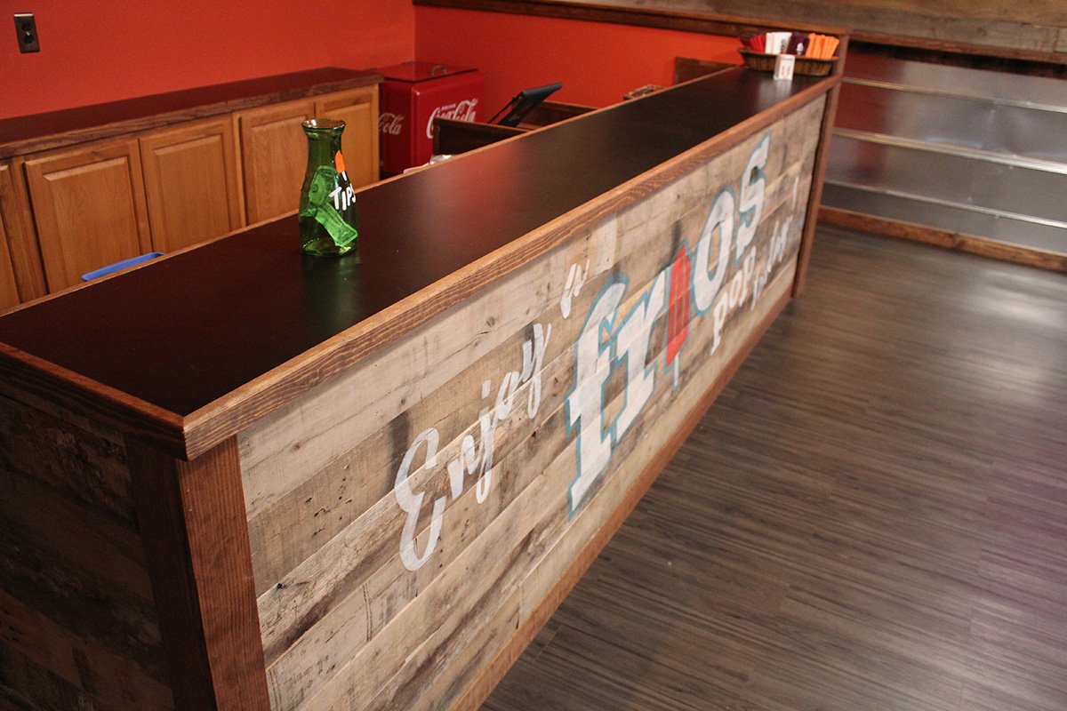 Retail store build out, with 100 year old barn wood walls and galvanized metal. Custom made sign with backlit logo, pendant light and counter display.