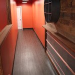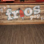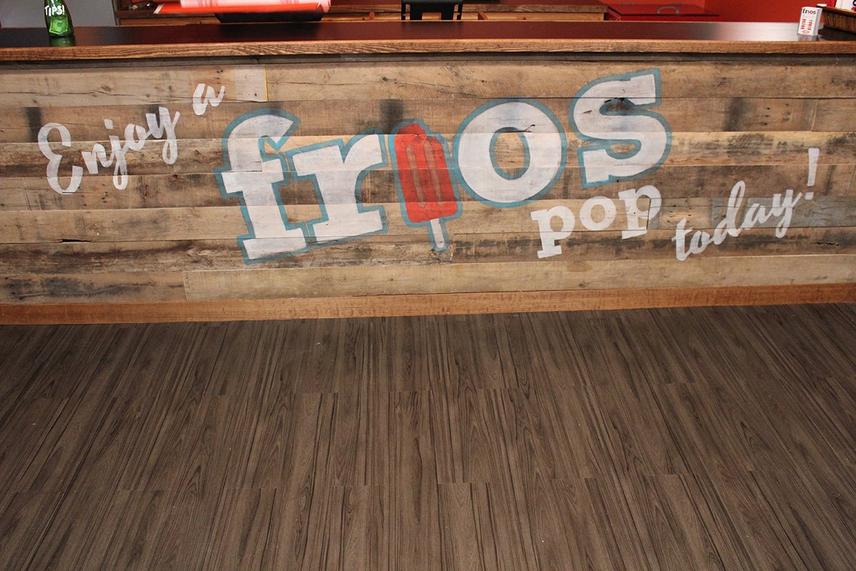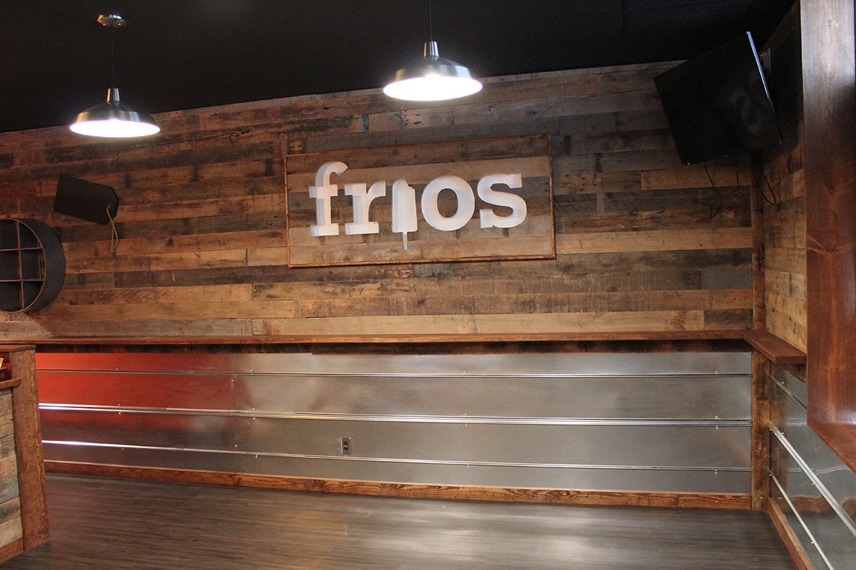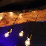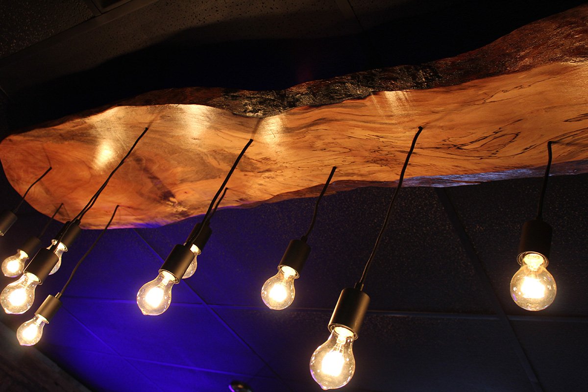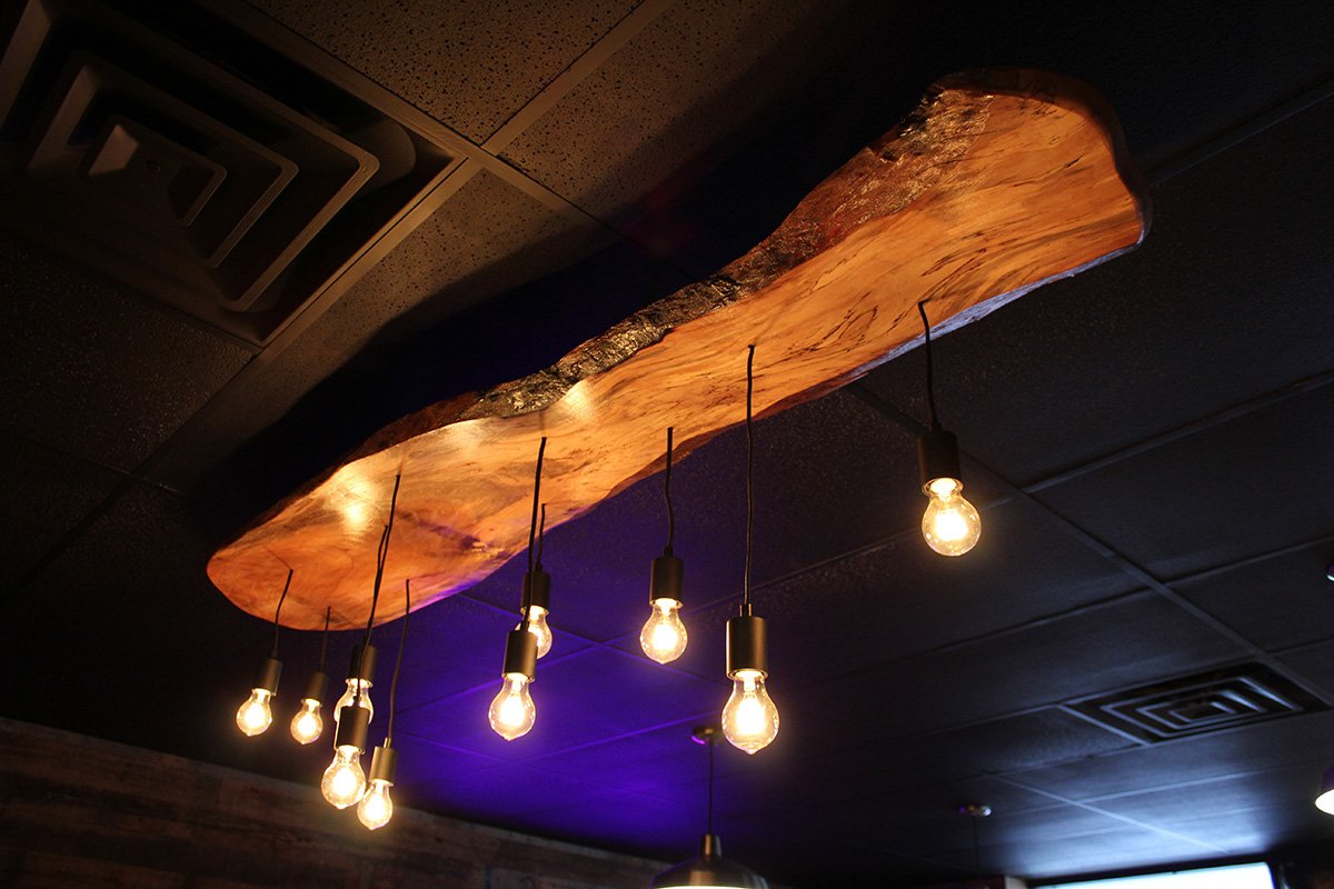 Retail store build out, with 100 year old barn wood walls and galvanized metal. Custom made sign with backlit logo, pendant light and counter display.