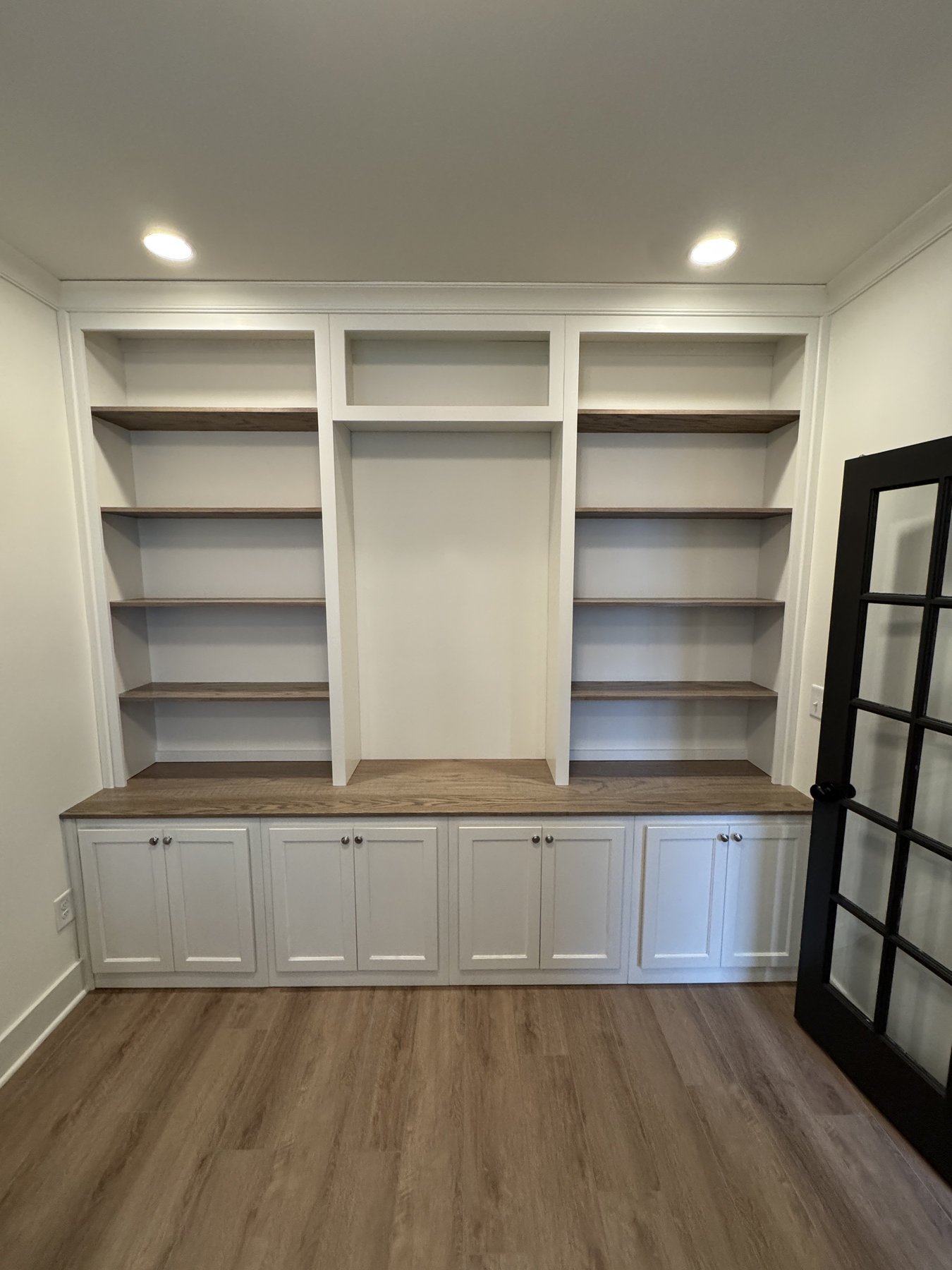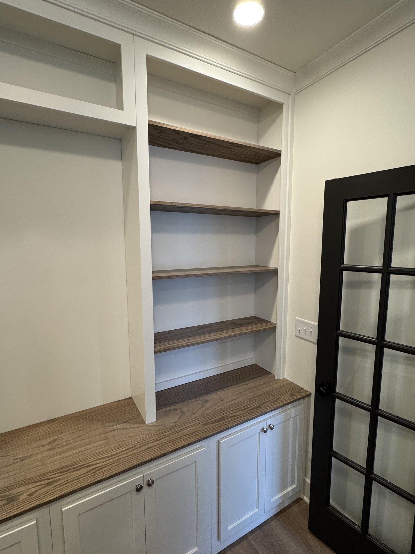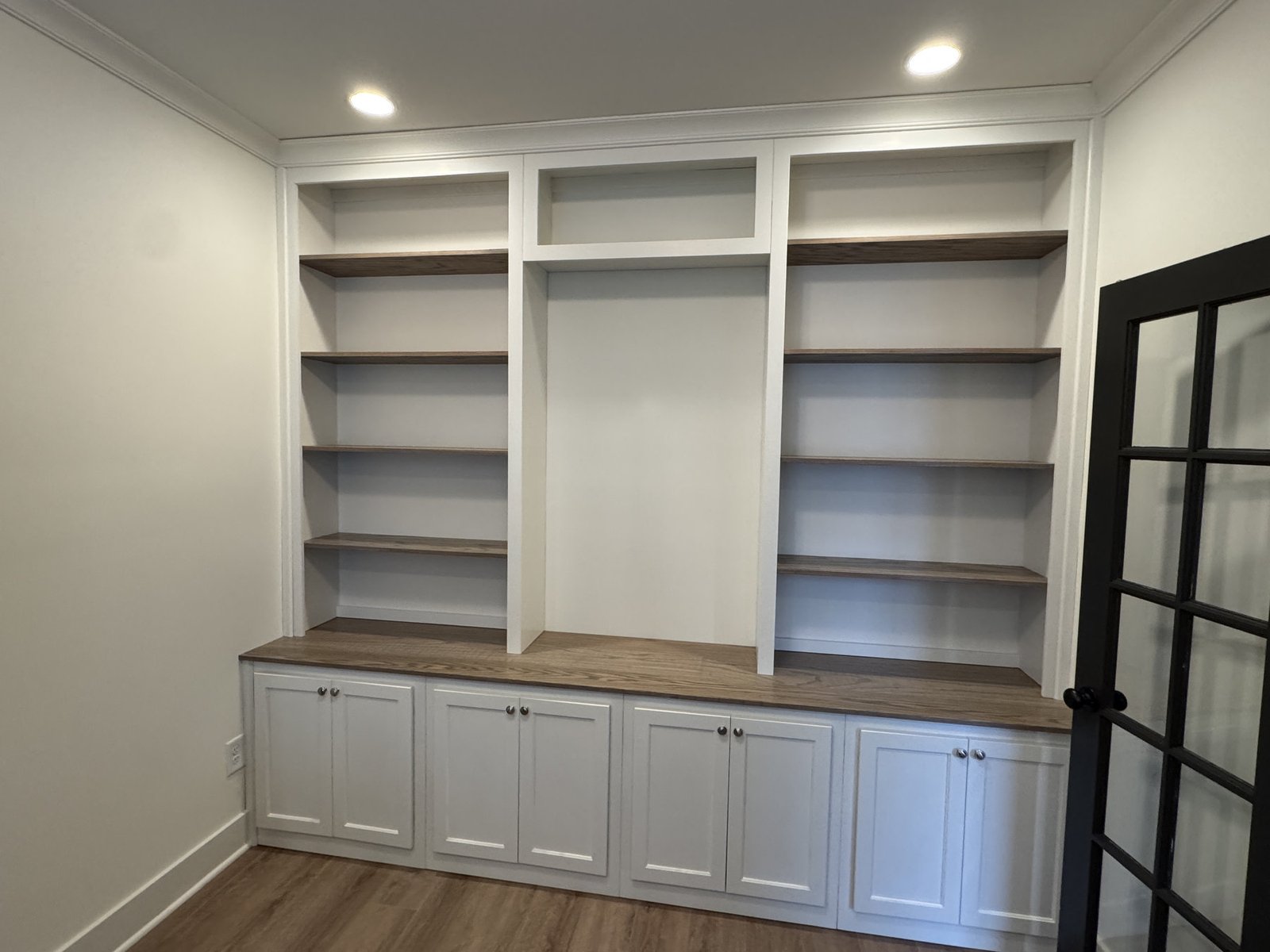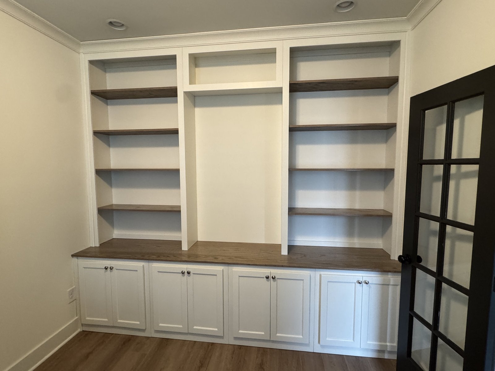 New built-ins , shelving and storage cabinets added to a home office. Tons of storage, cabinets and a bridge.
