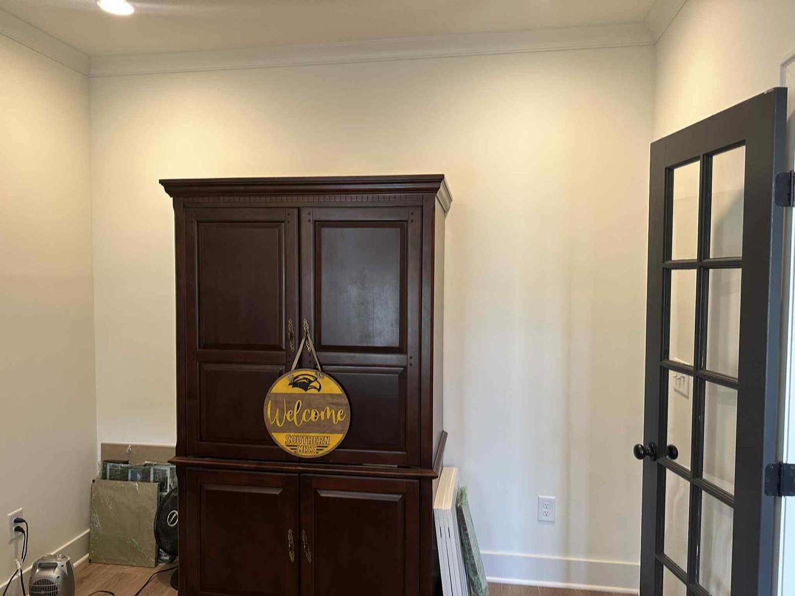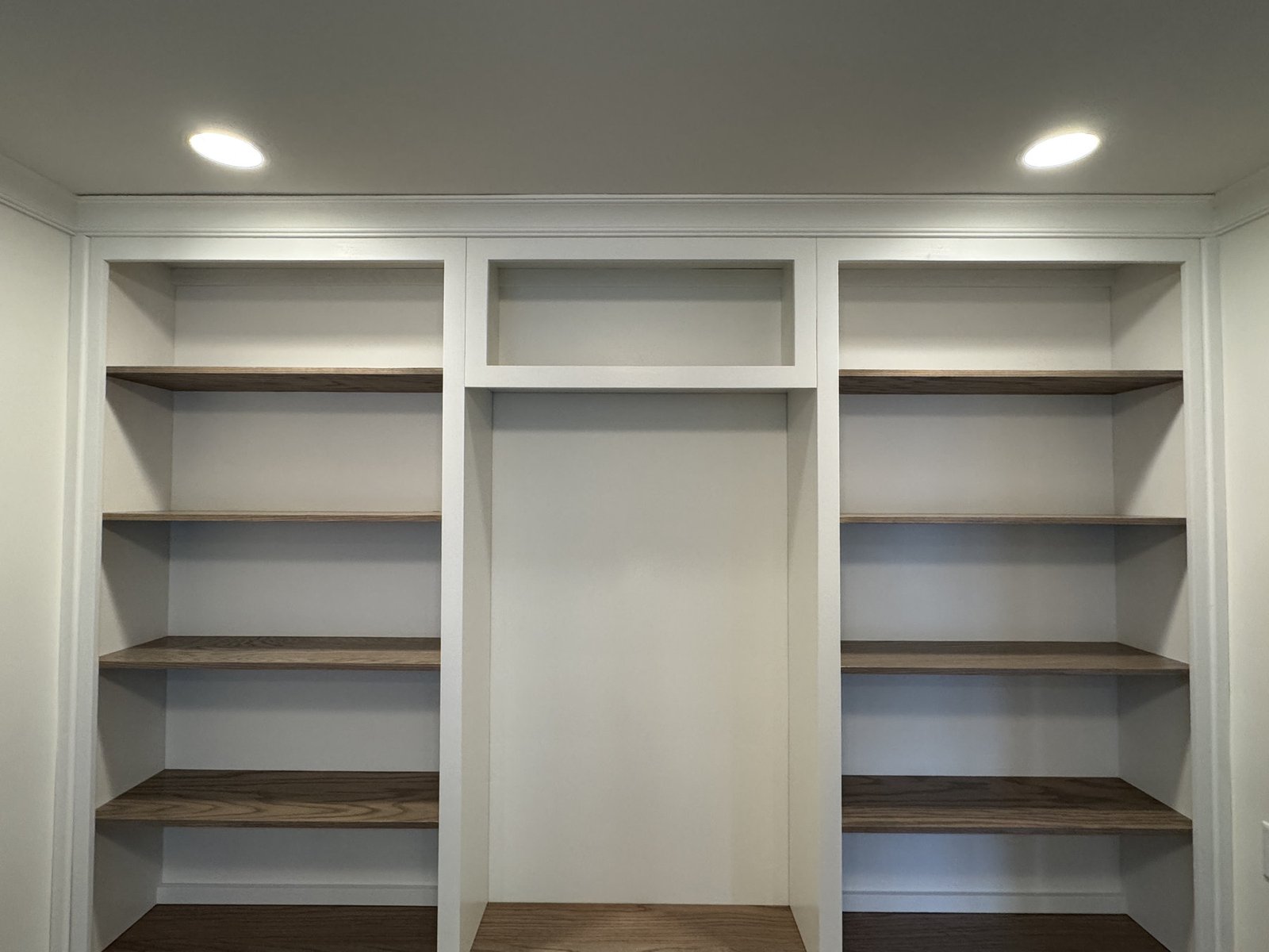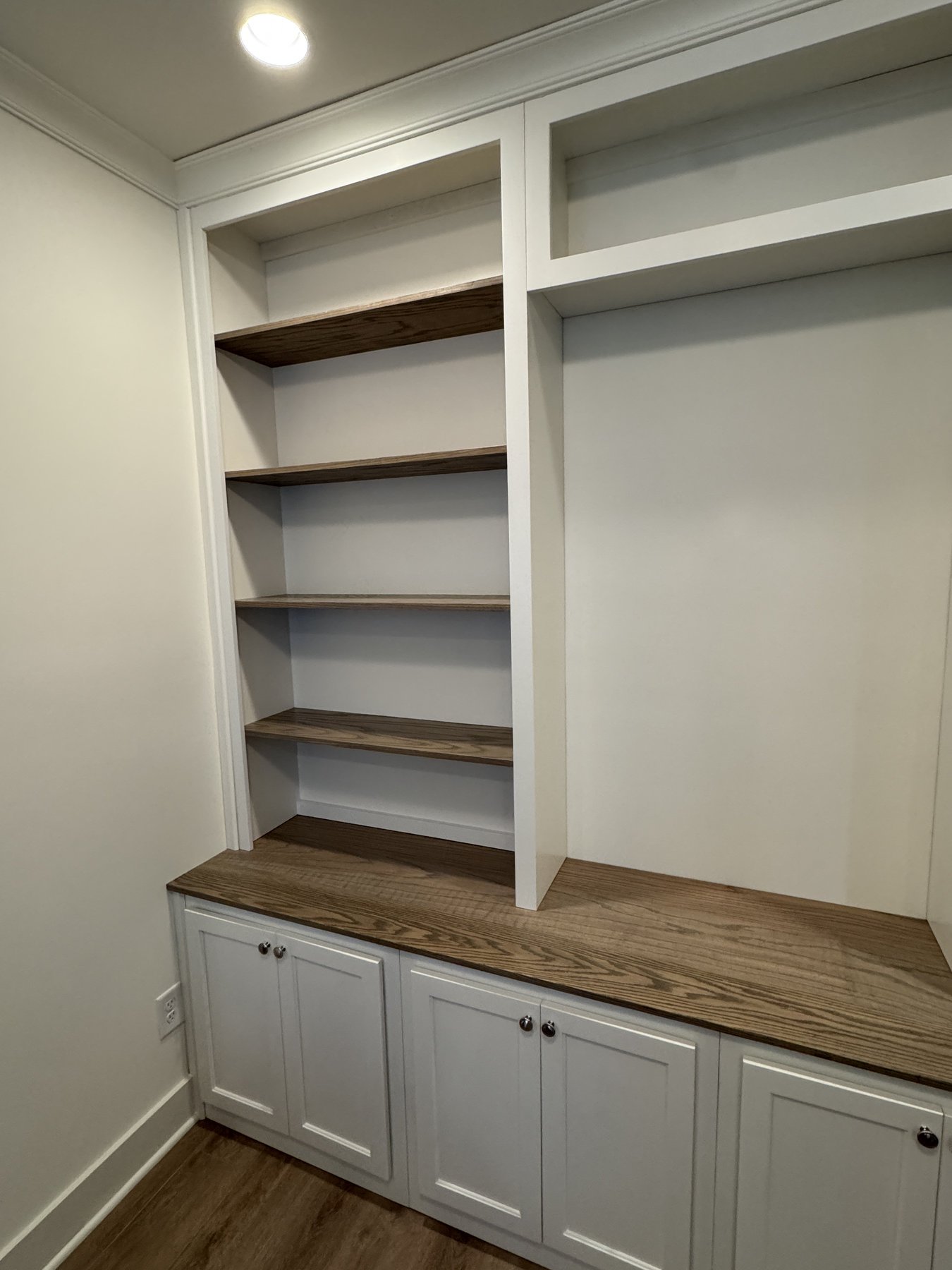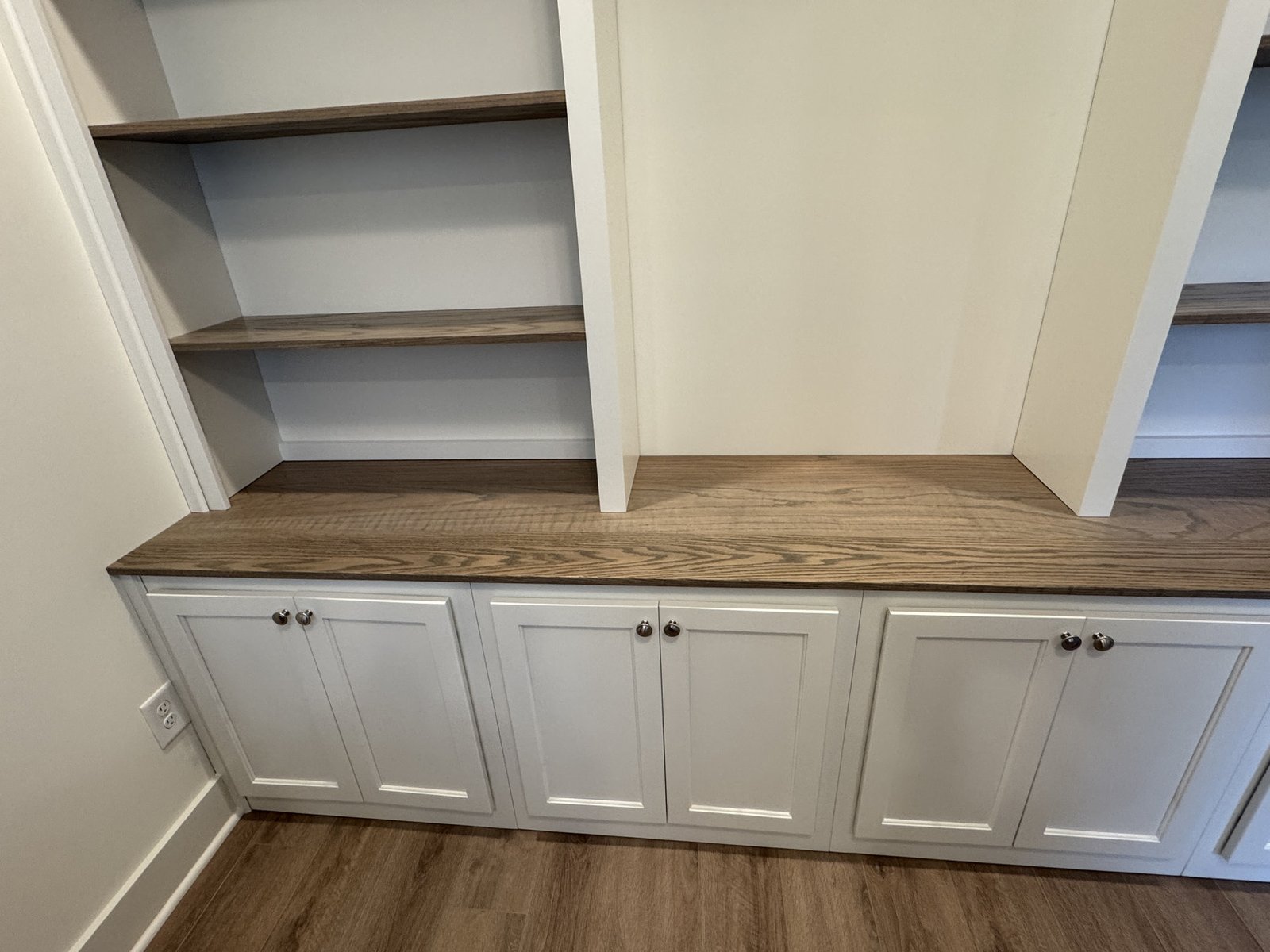 New built-ins , shelving and storage cabinets added to a home office. Tons of storage, cabinets and a bridge.