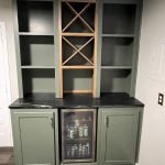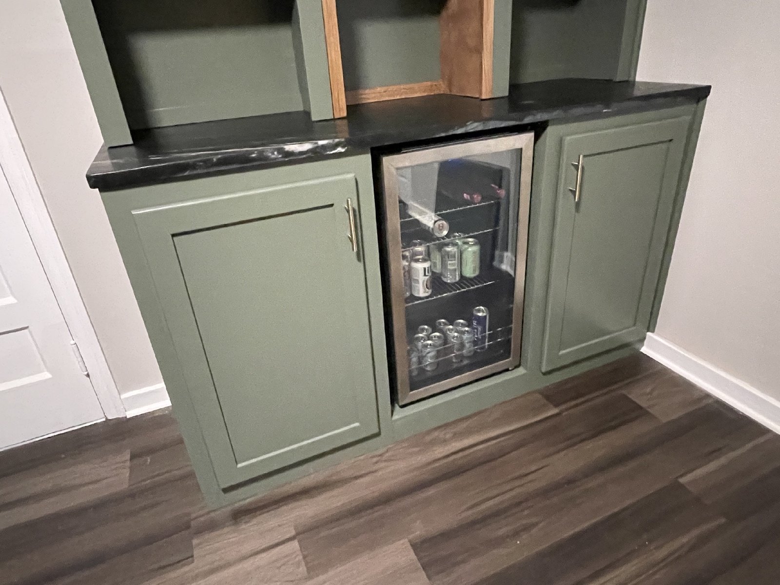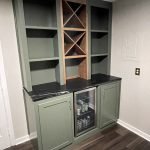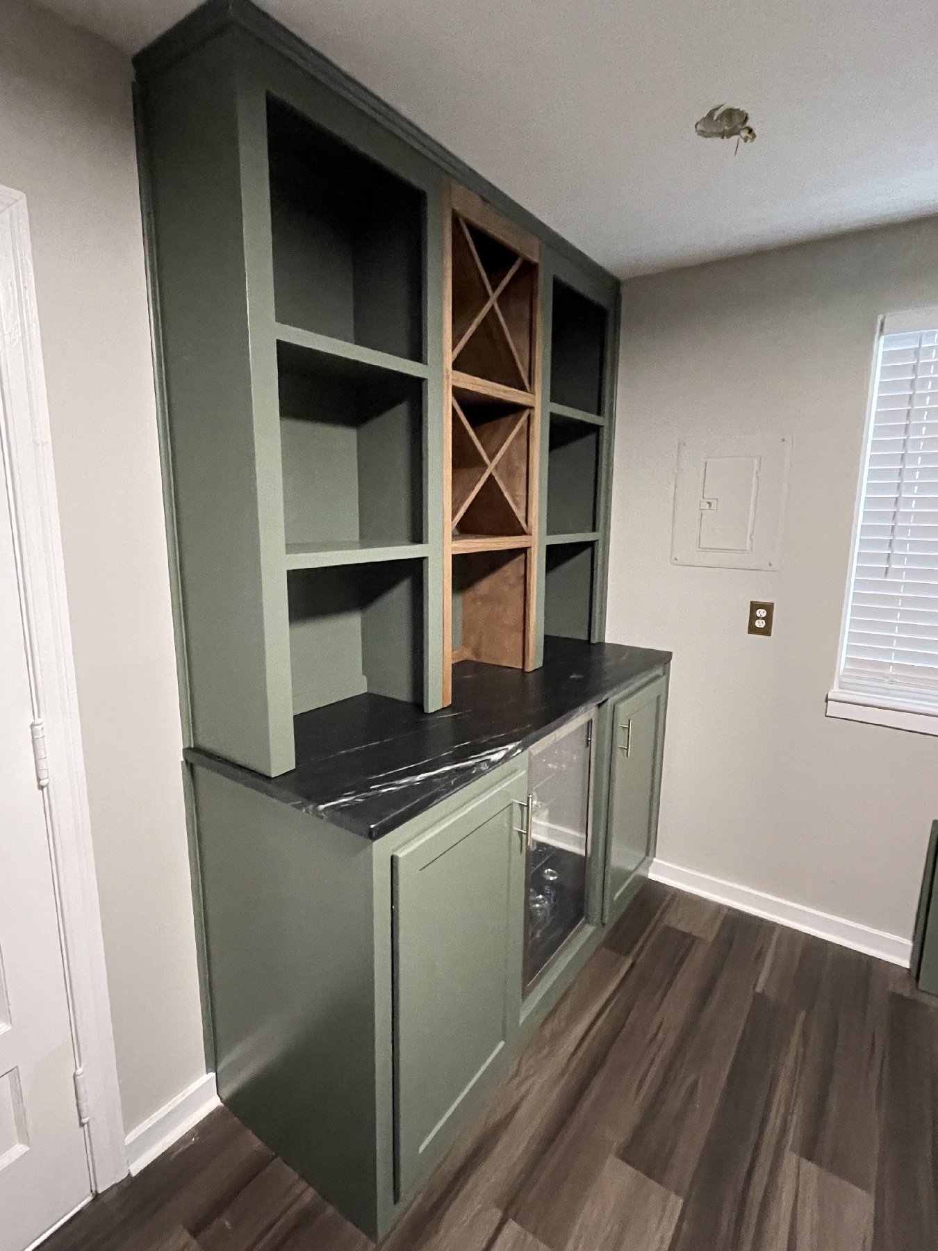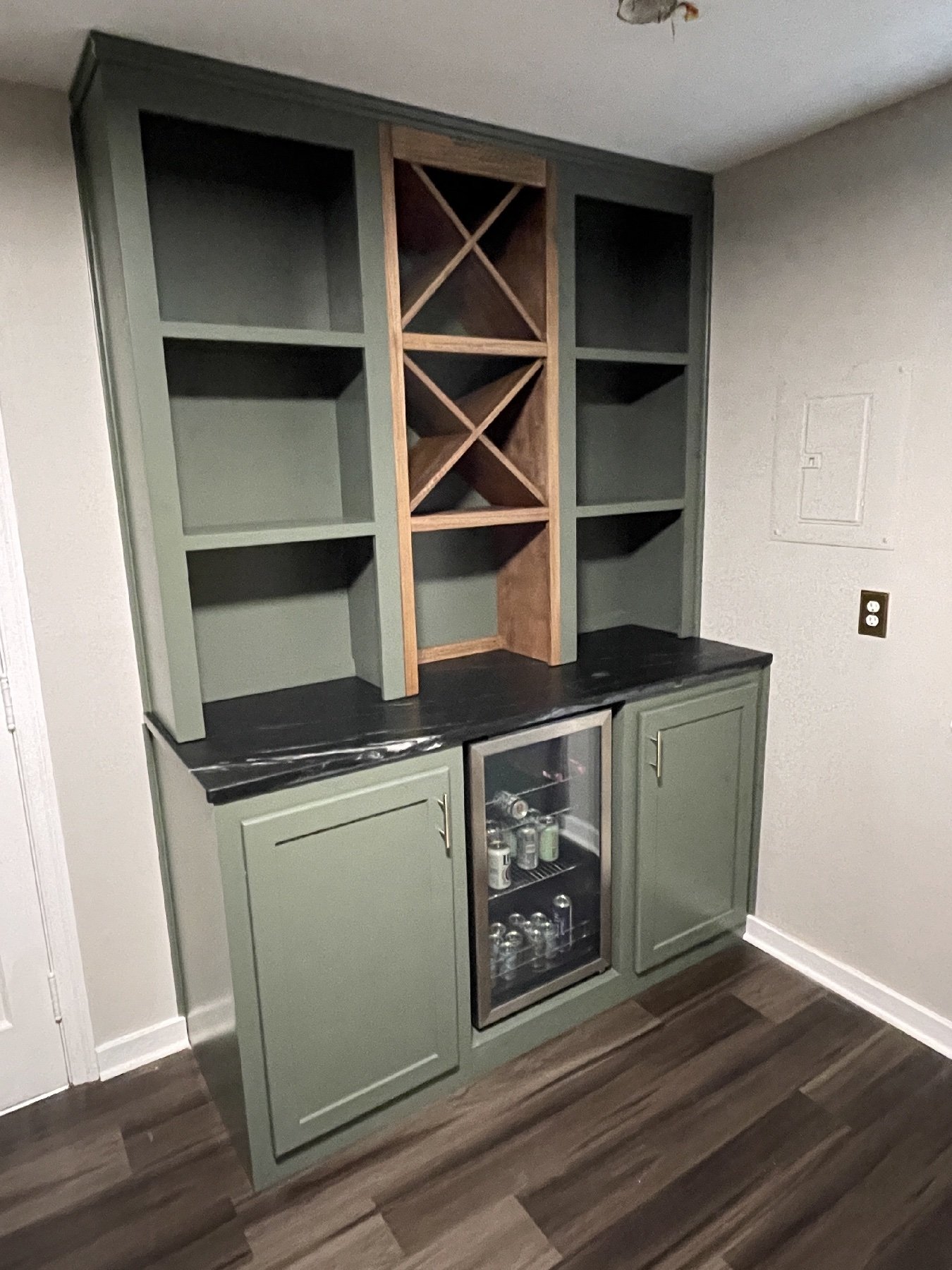 New Bar added to a kitchen. Nice display and storage for wines and other beverages. Shelving, cabinet storage and a drink fridge cap off a needed niche for an empty wall.