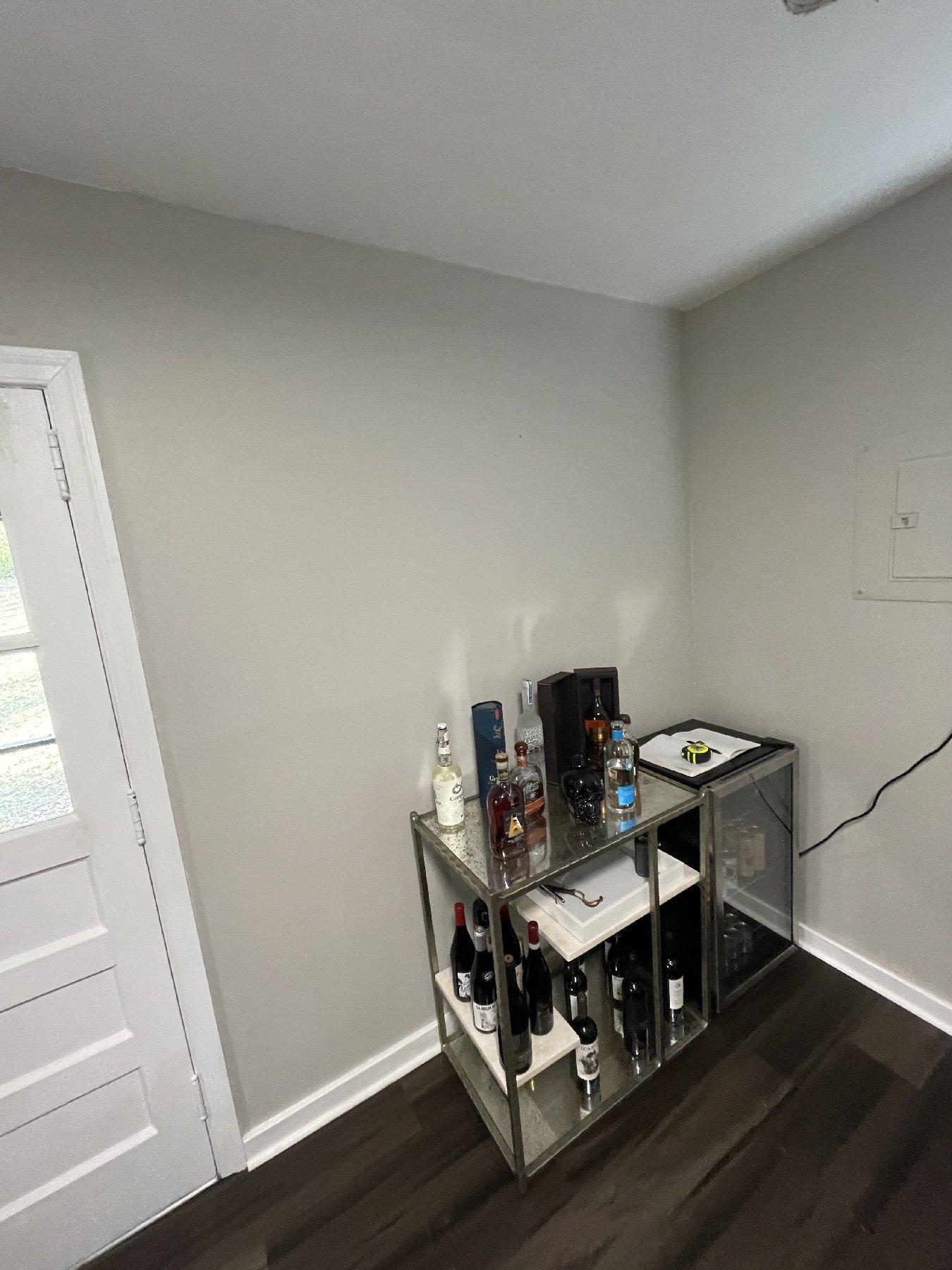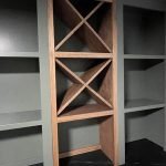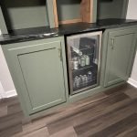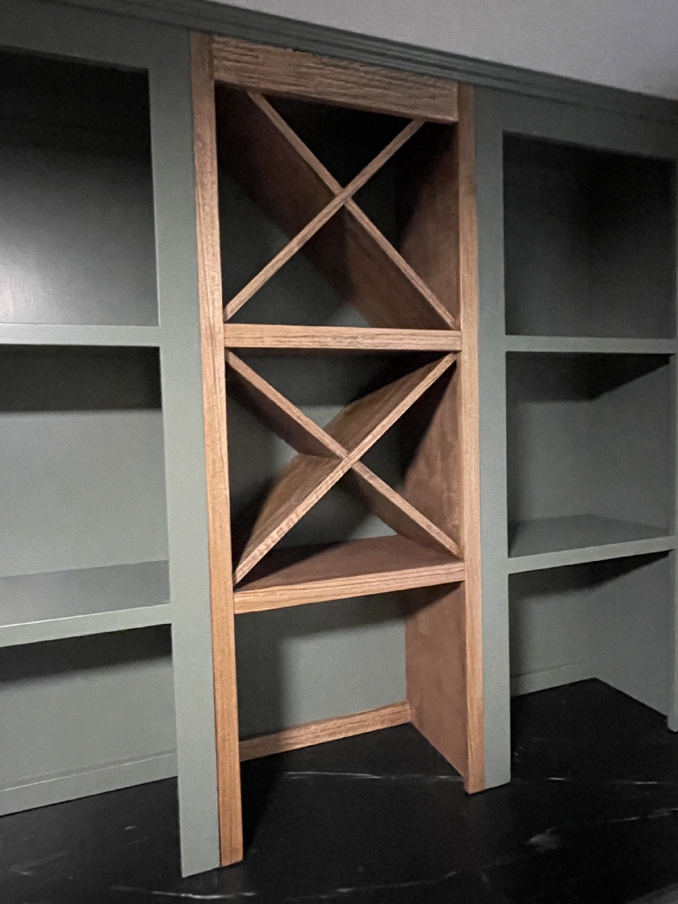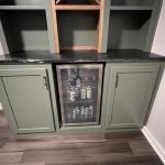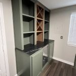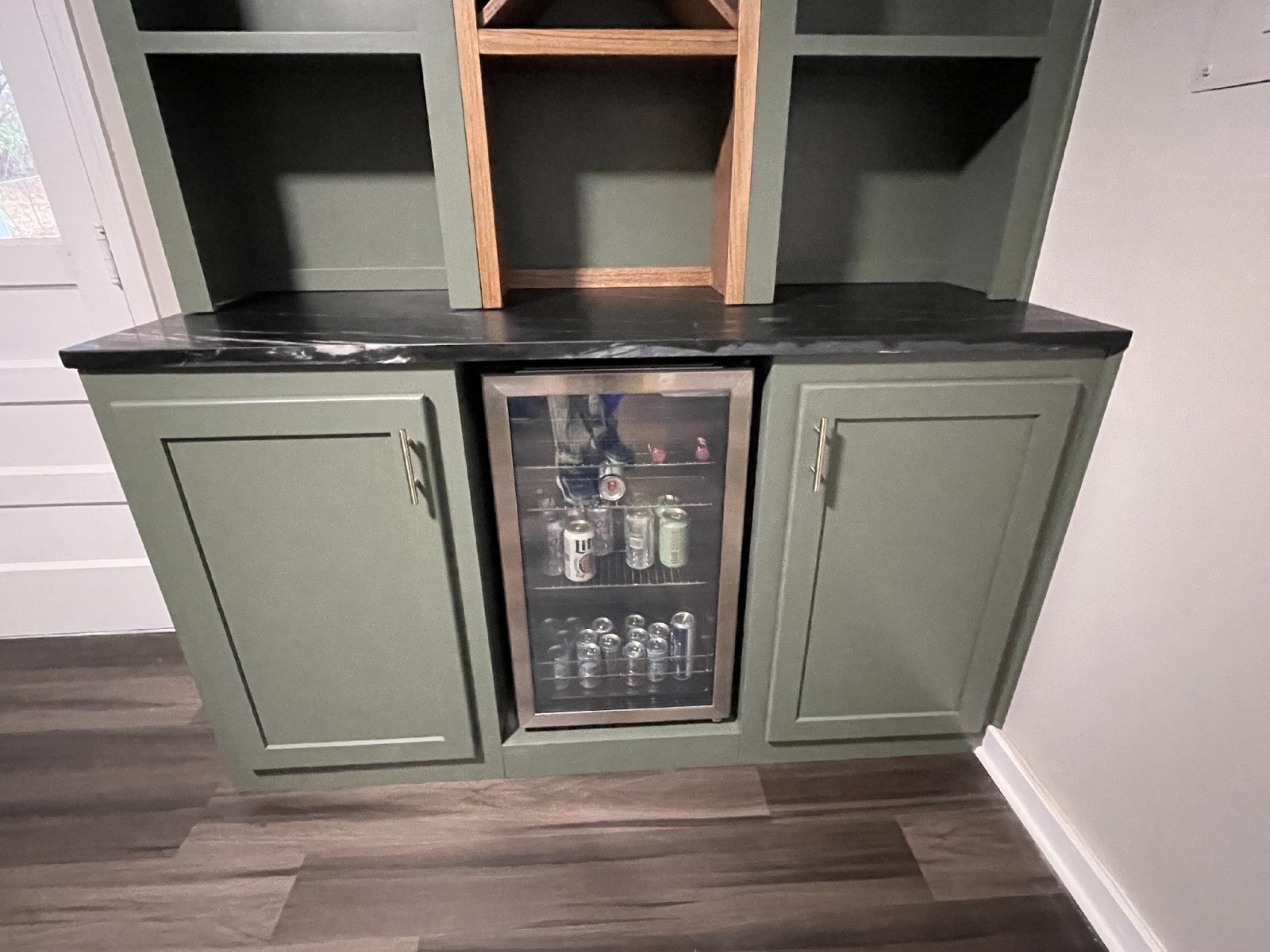 New Bar added to a kitchen. Nice display and storage for wines and other beverages. Shelving, cabinet storage and a drink fridge cap off a needed niche for an empty wall.