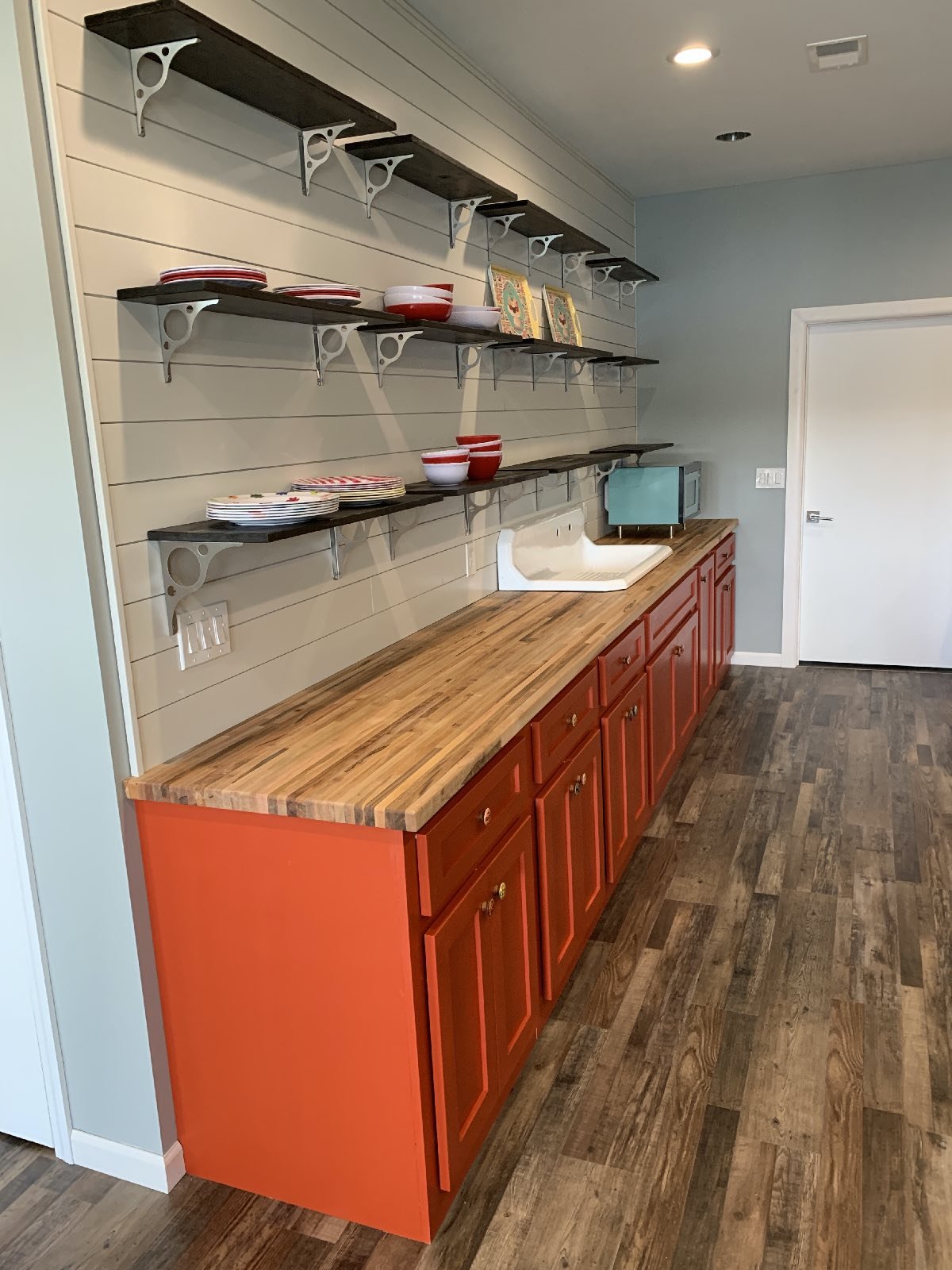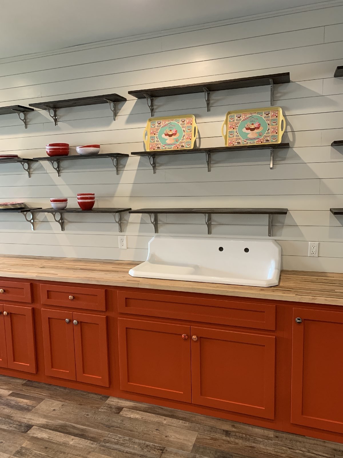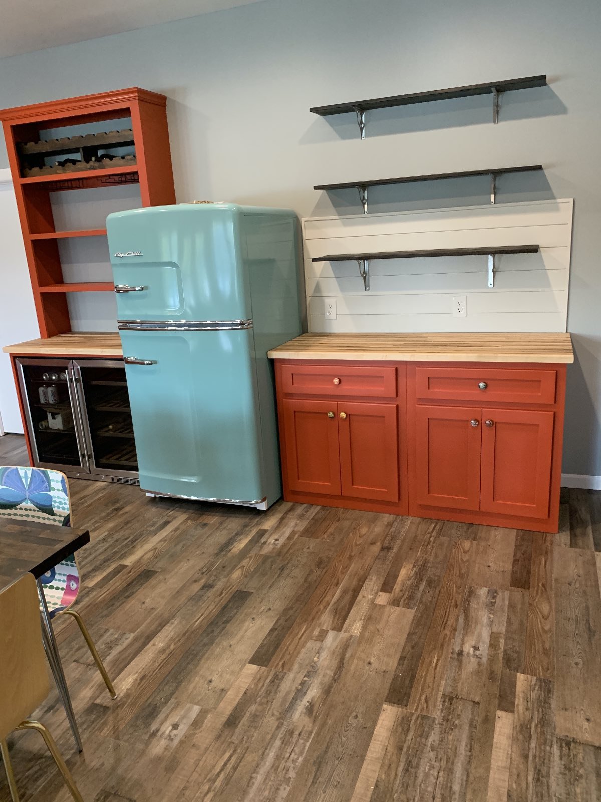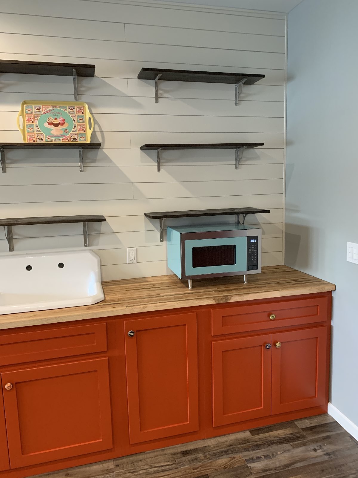 Pretty happy with the end result of this Lakehouse project. Basement level kitchenette added… tons of new cabinets, open shelving on a shiplap wall. LOVE the retro fridge/microwave they picked out too. Could NOT have done it with my “crew”… thank you Roberta Wohn & Ron Wohn. And thanks to the homeowners for allowing me to stay at this lovely home during the remodel. (Oh, and had time to finish all the trim & bath vanity doors/drawers).