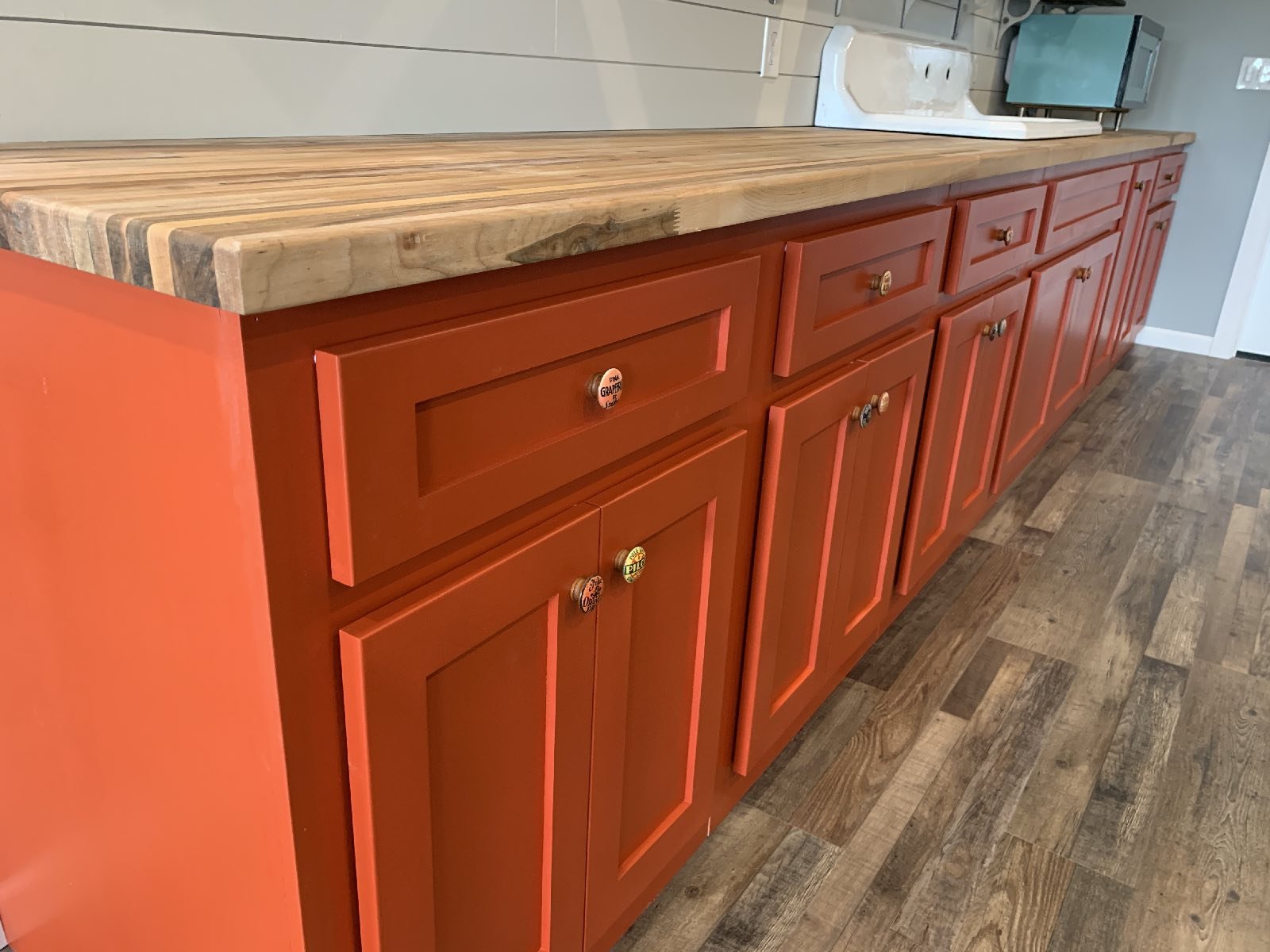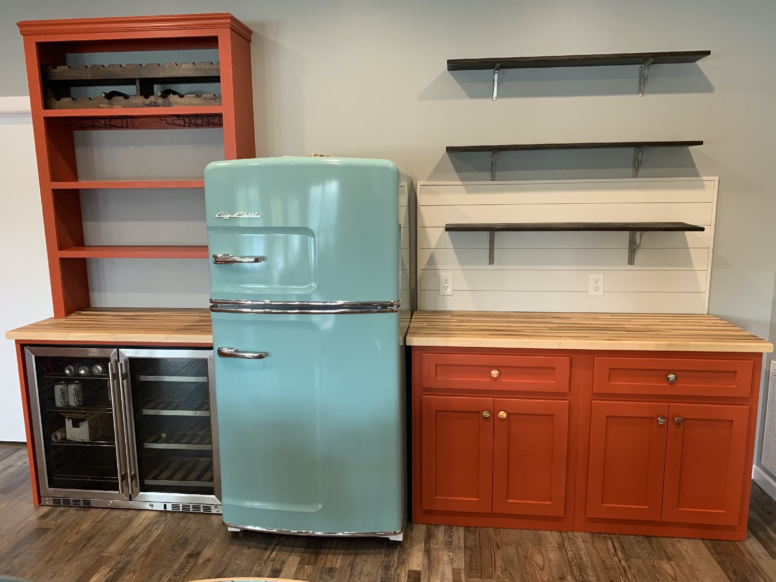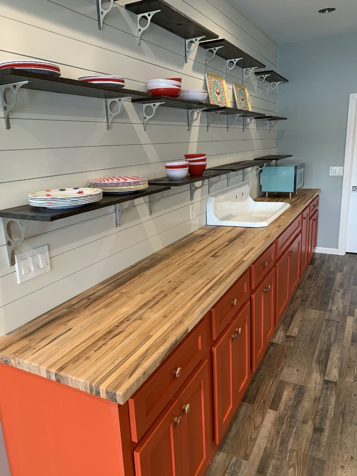Pretty happy with the end result of this Lakehouse project. Basement level kitchenette added… tons of new cabinets, open shelving on a shiplap wall. LOVE the retro fridge/microwave they picked out too. Could NOT have done it with my “crew”… thank you Roberta Wohn & Ron Wohn. And thanks to the homeowners for allowing me to stay at this lovely home during the remodel. (Oh, and had time to finish all the trim & bath vanity doors/drawers).