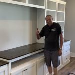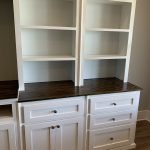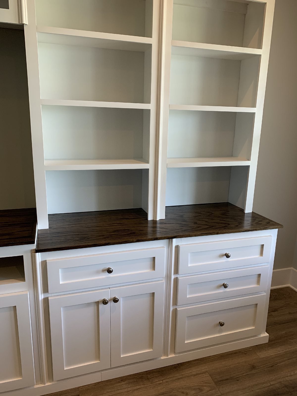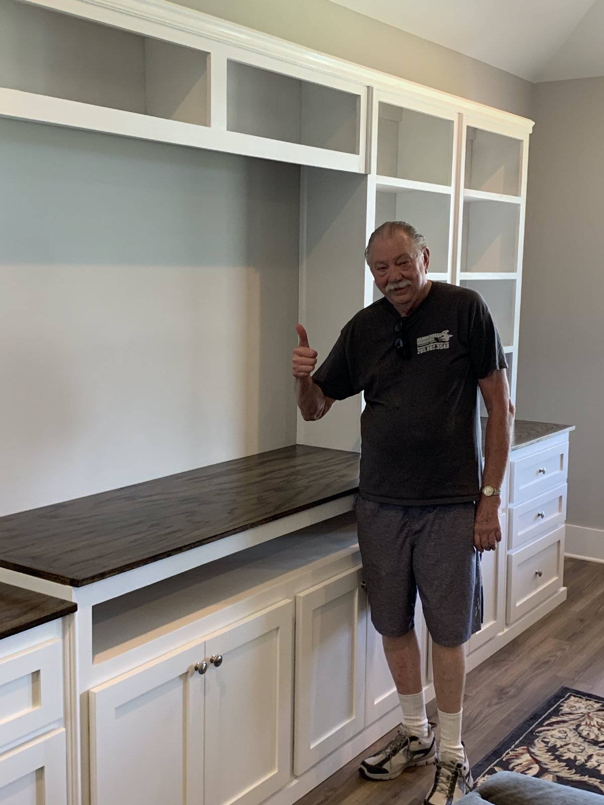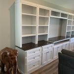 Custom Cabinetry for a new homes living room. 16′ long with bridge connecting the units – room for the largest of flat panels!