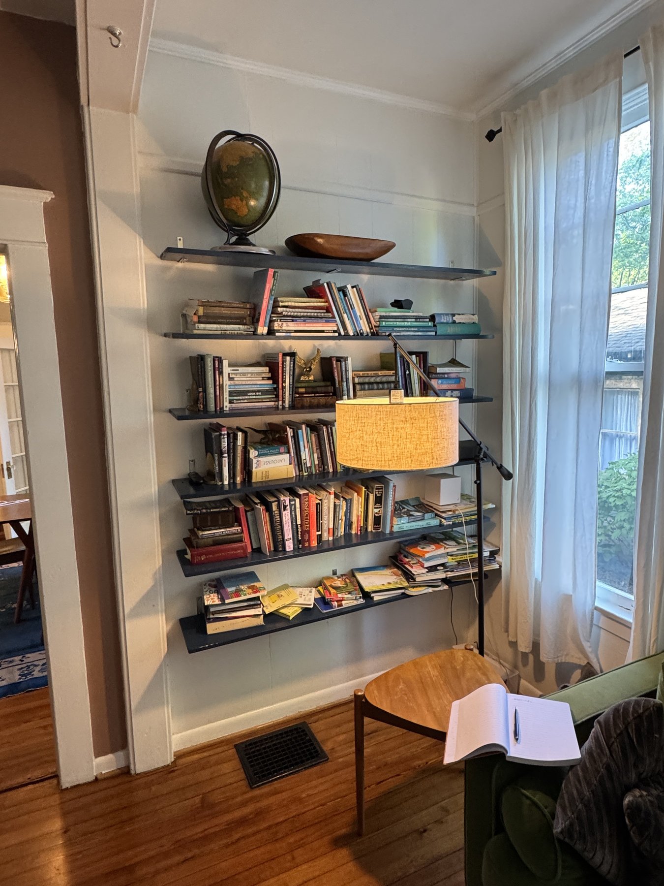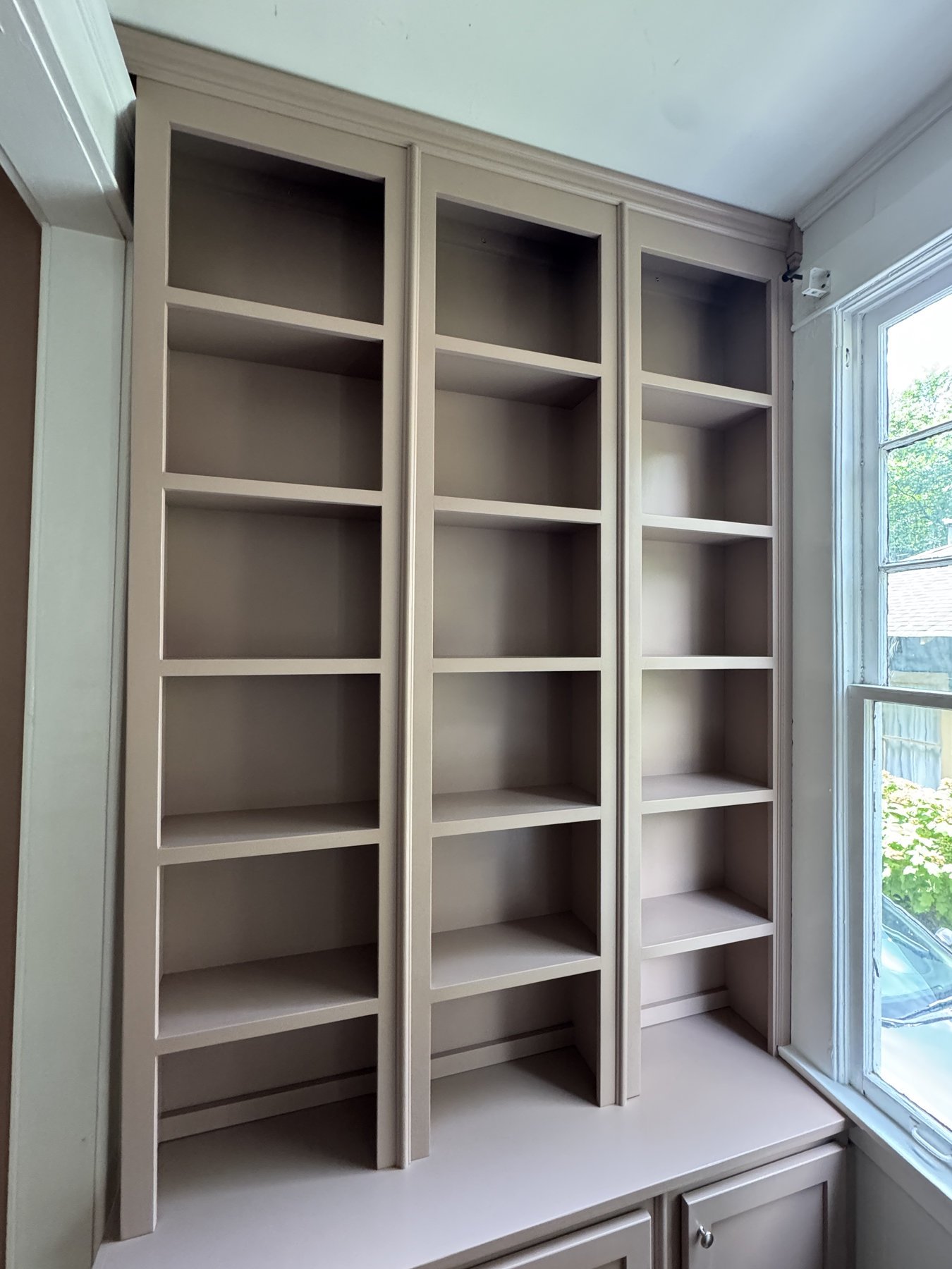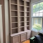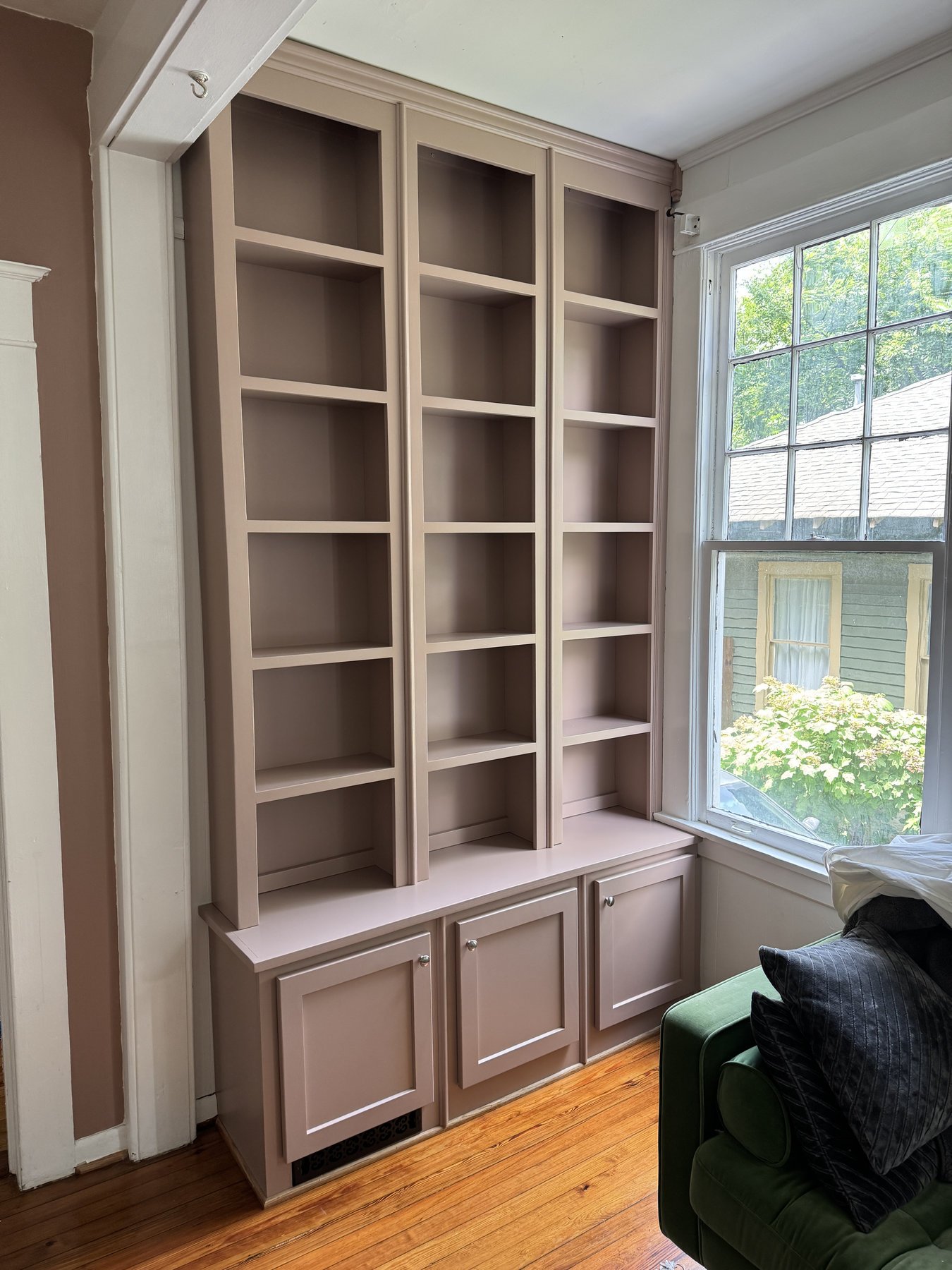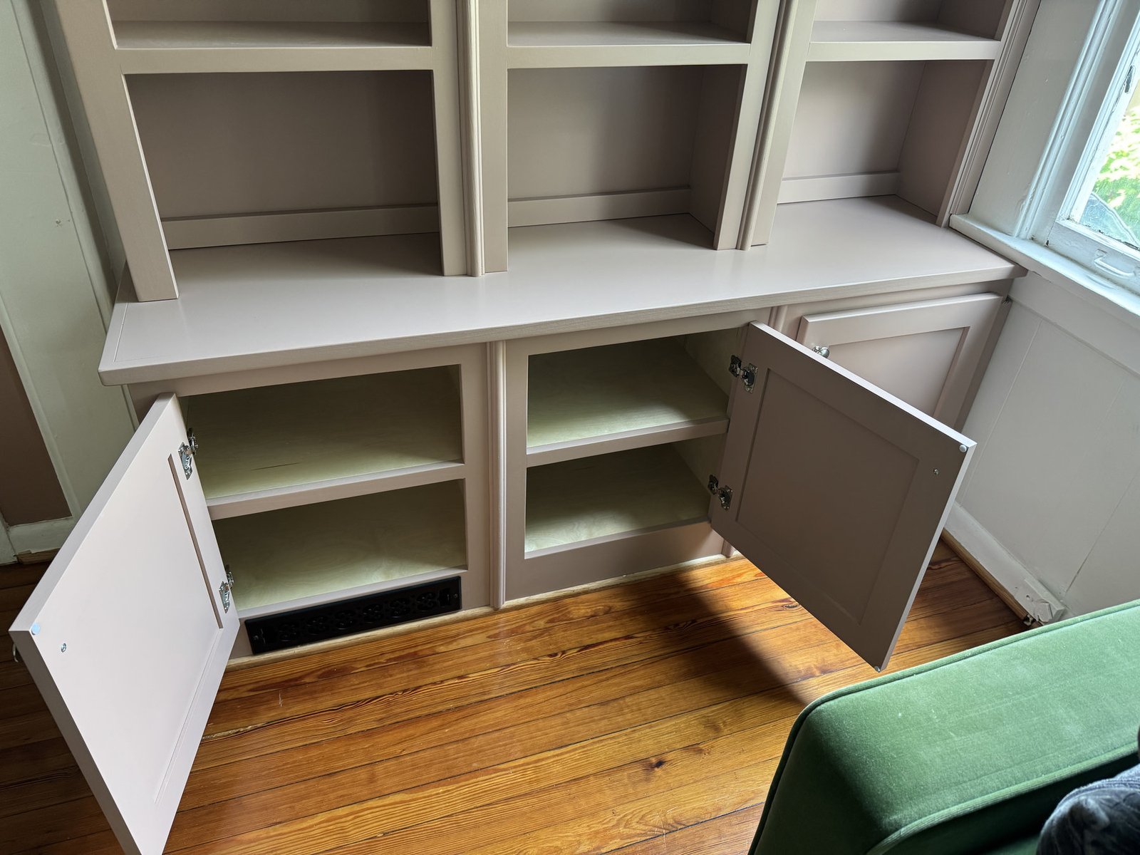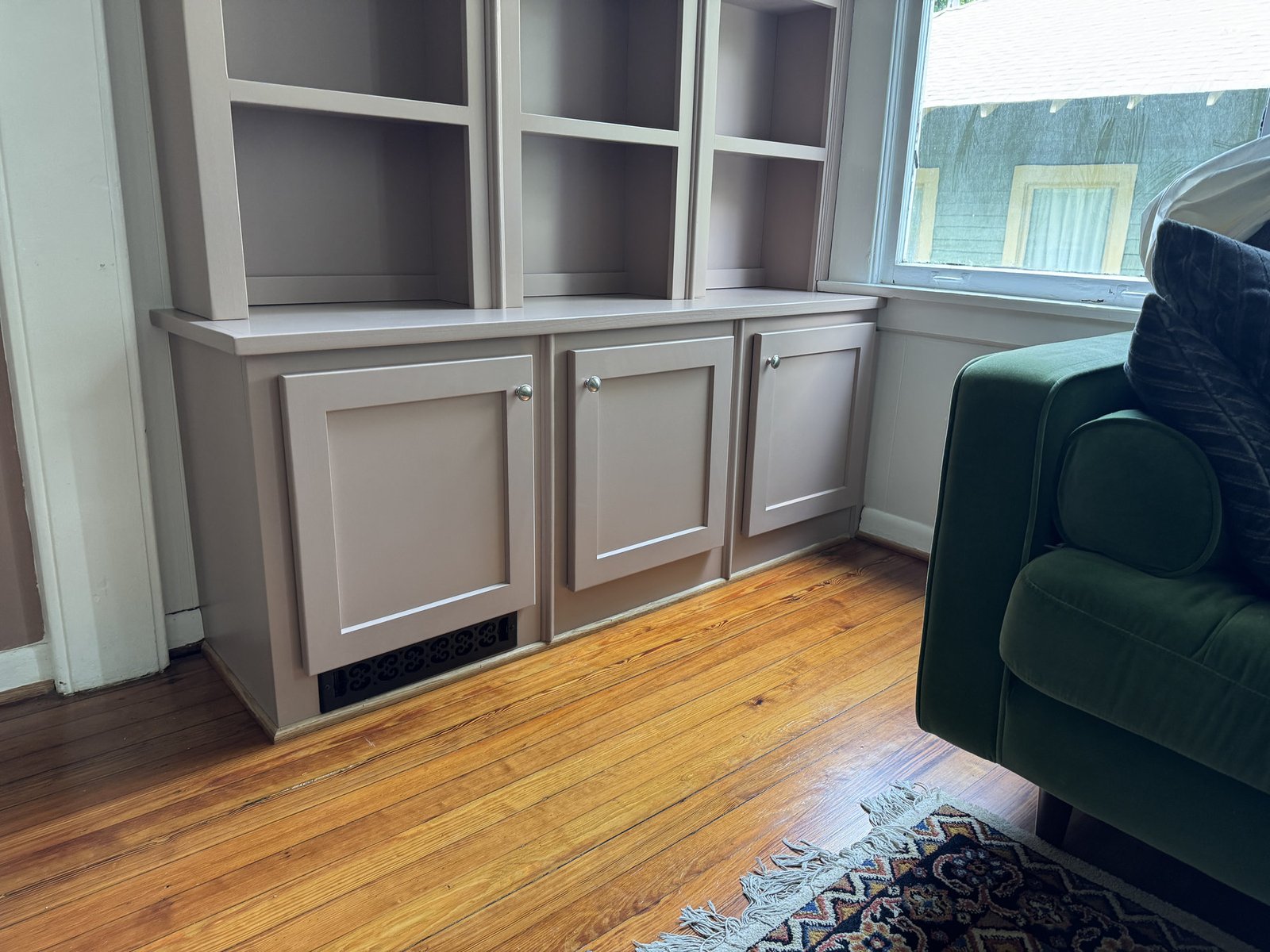 Added much-needed shelving and storage to an older home in the downtown Birmingham area. Tucked into a current nook that already had shelving, we worked around the register and window to fit these pieces in.