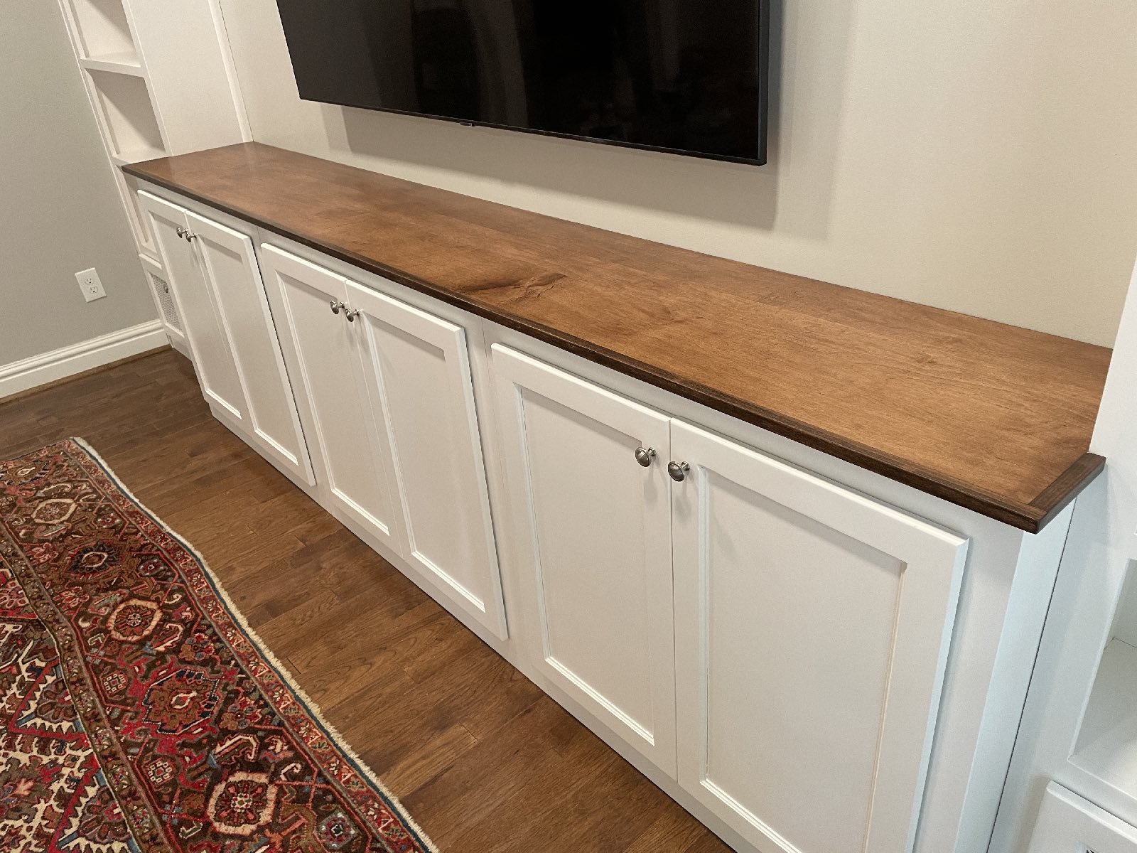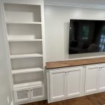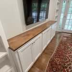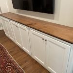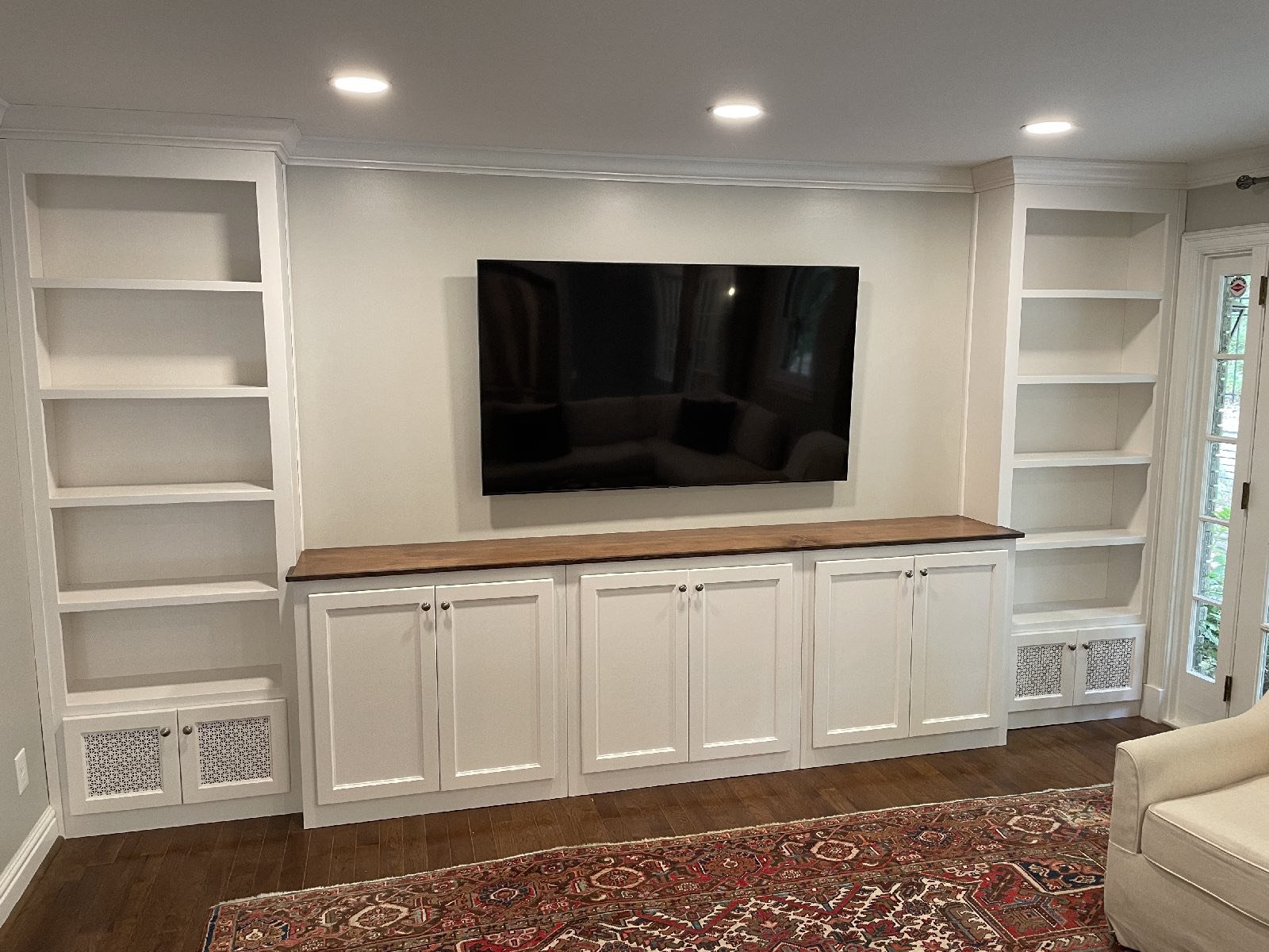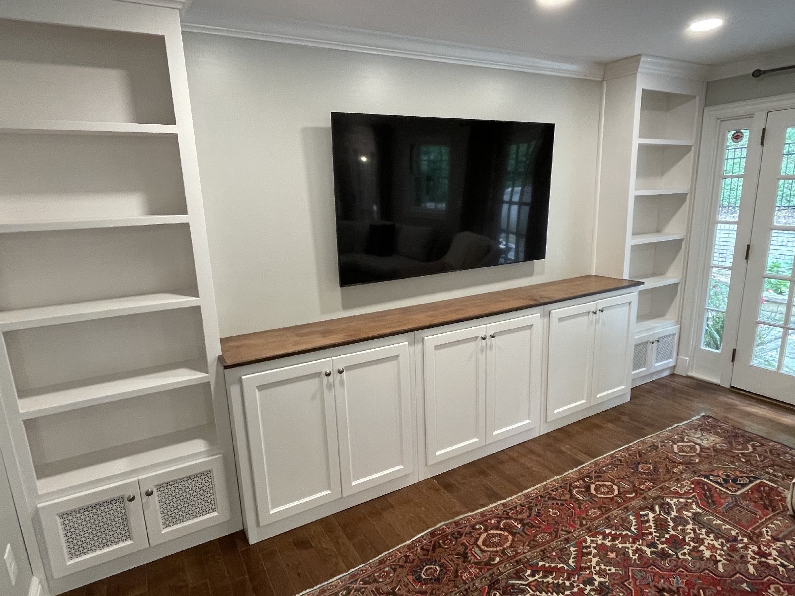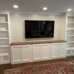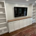 Adding storage, function and beauty to this living room wall. Enough room for a 70″ TV and metal vented lower doors for air ventilation.