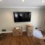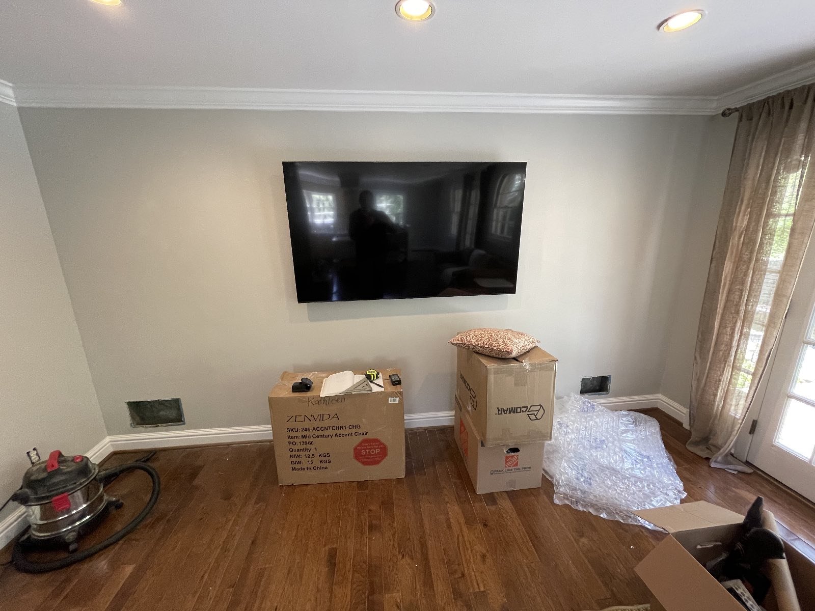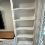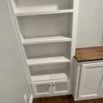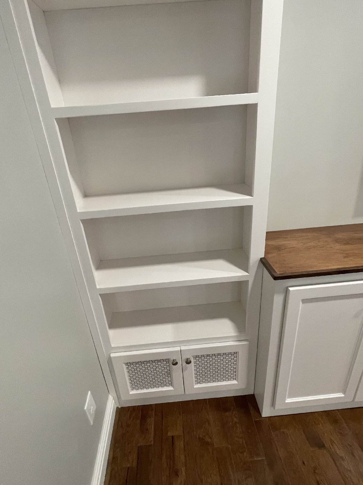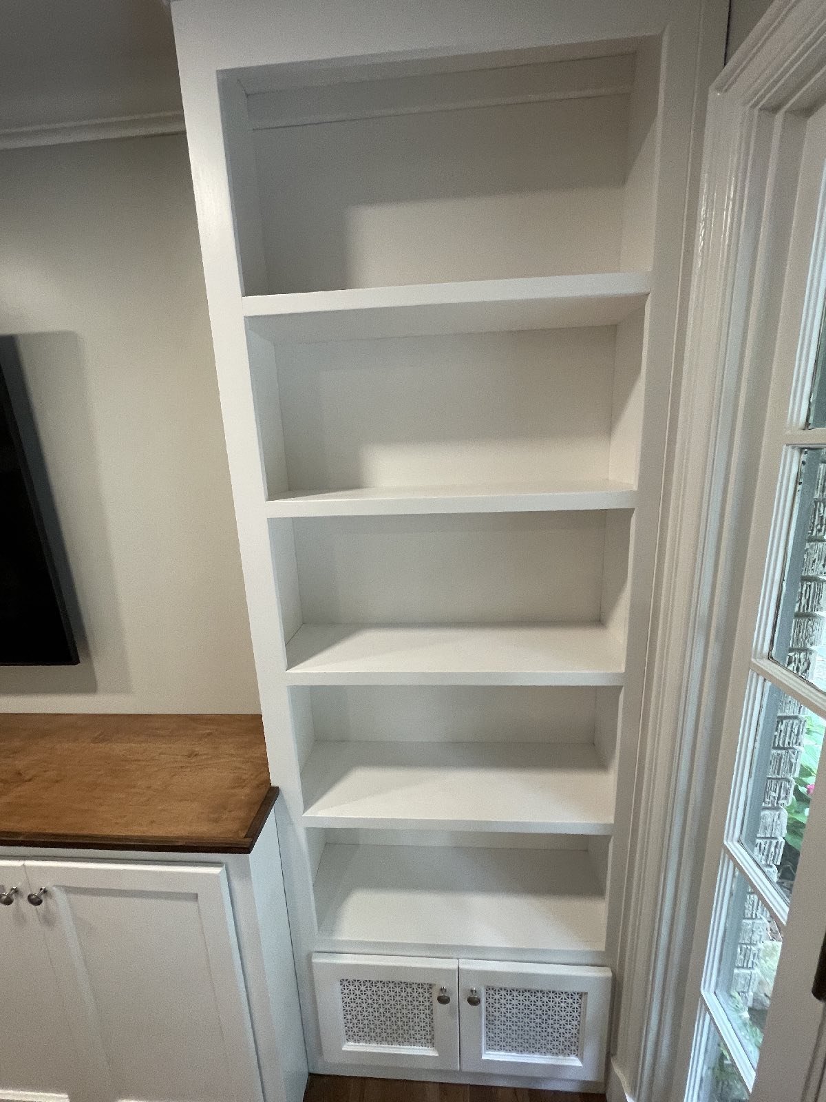 Adding storage, function and beauty to this living room wall. Enough room for a 70″ TV and metal vented lower doors for air ventilation.