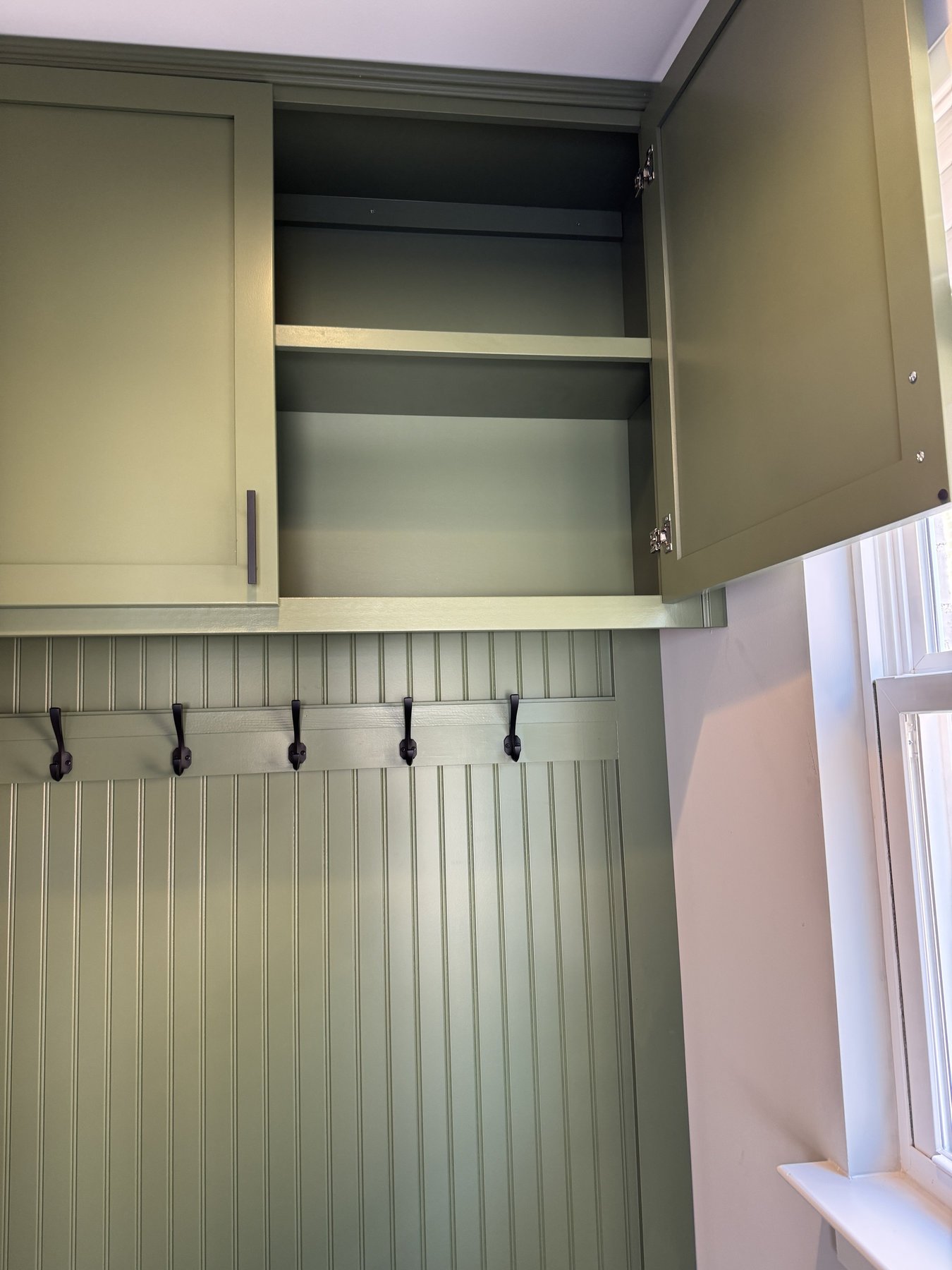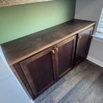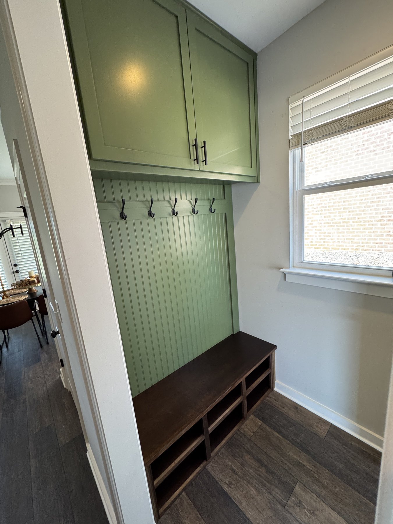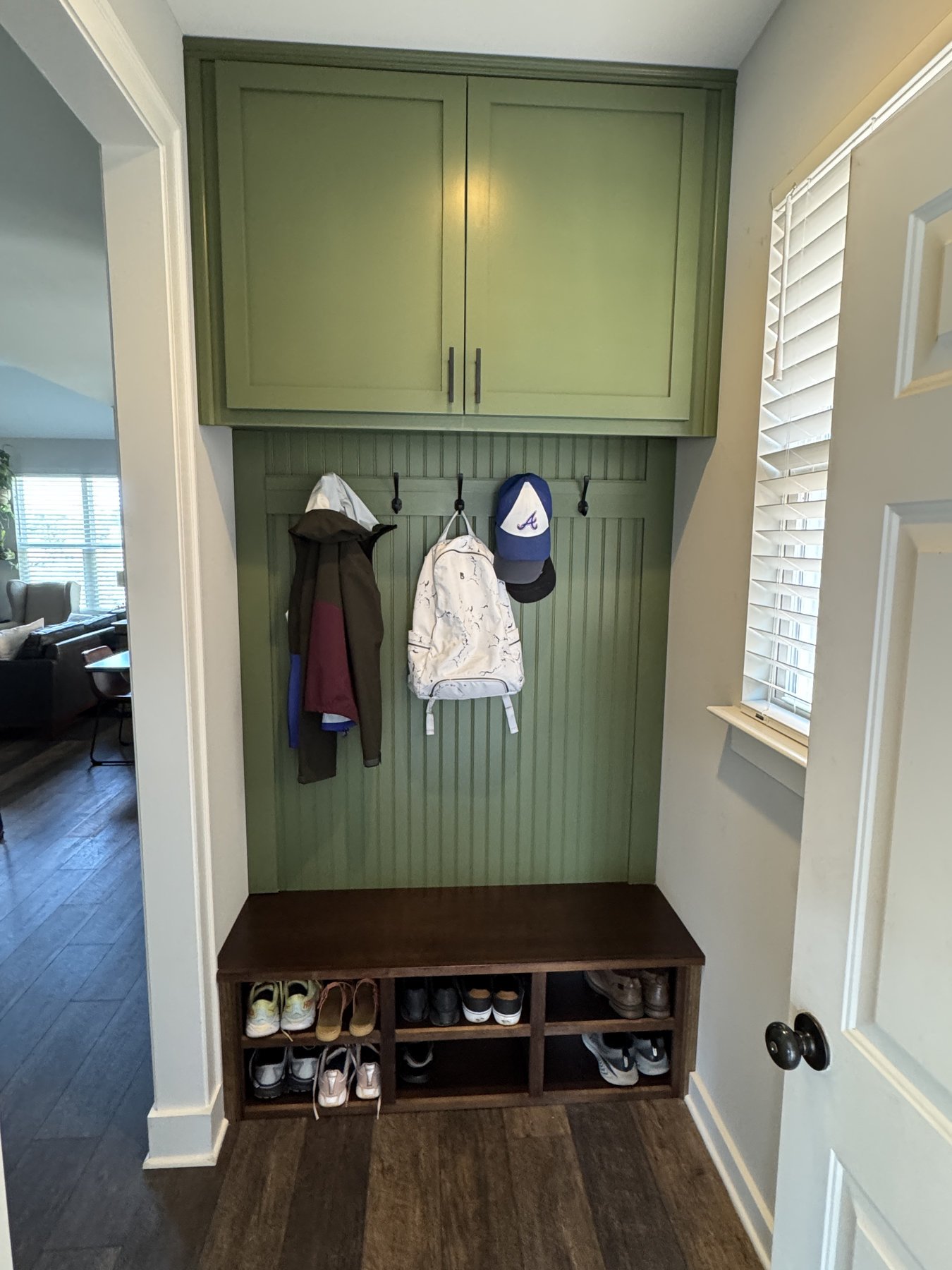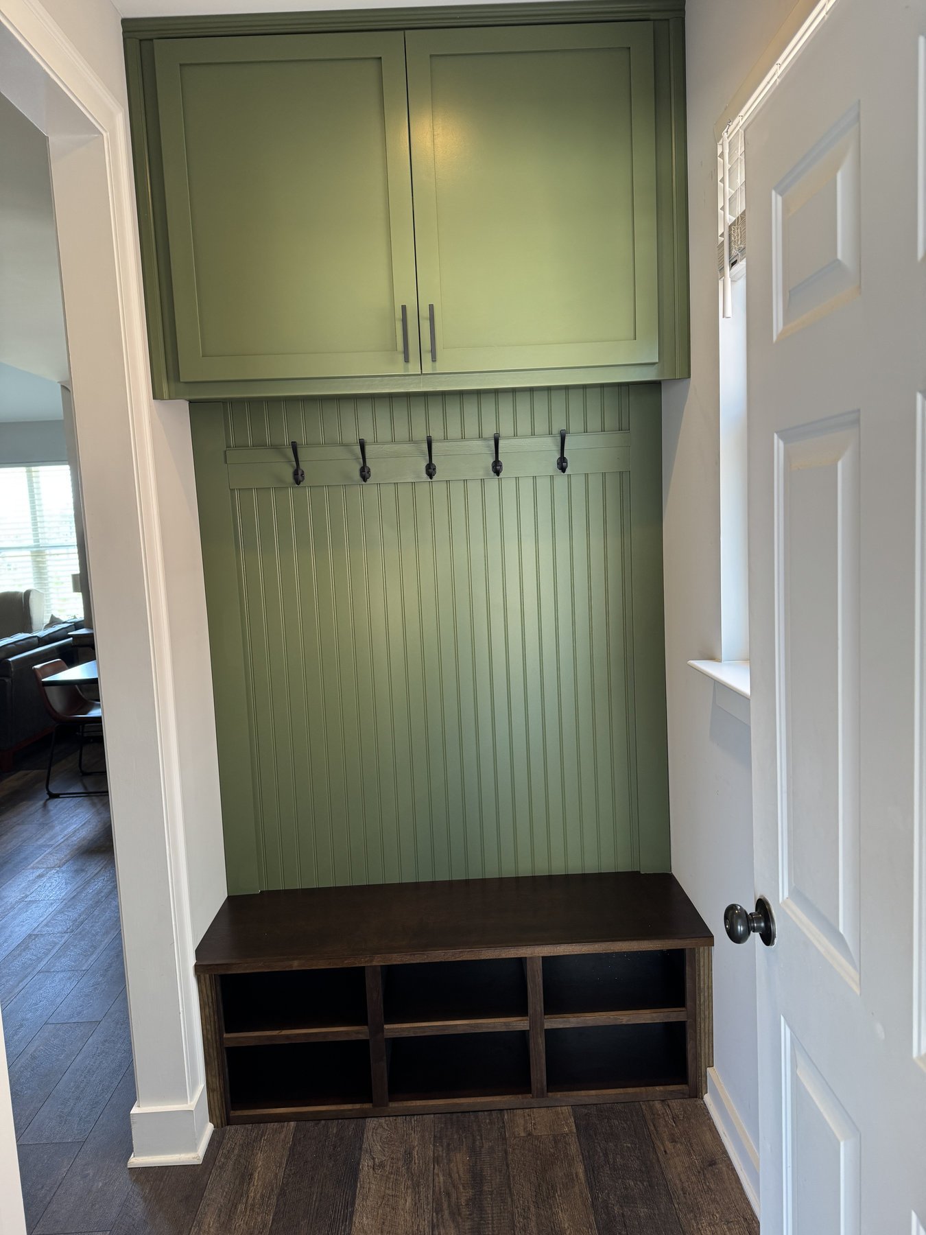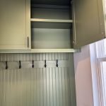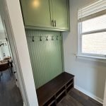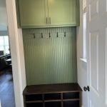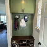 We added a cabinet under some existing shelving in the living room and a mudroom off the garage allowed for this added storage, seating and hangings with darker colors and accent stain bench seat.