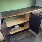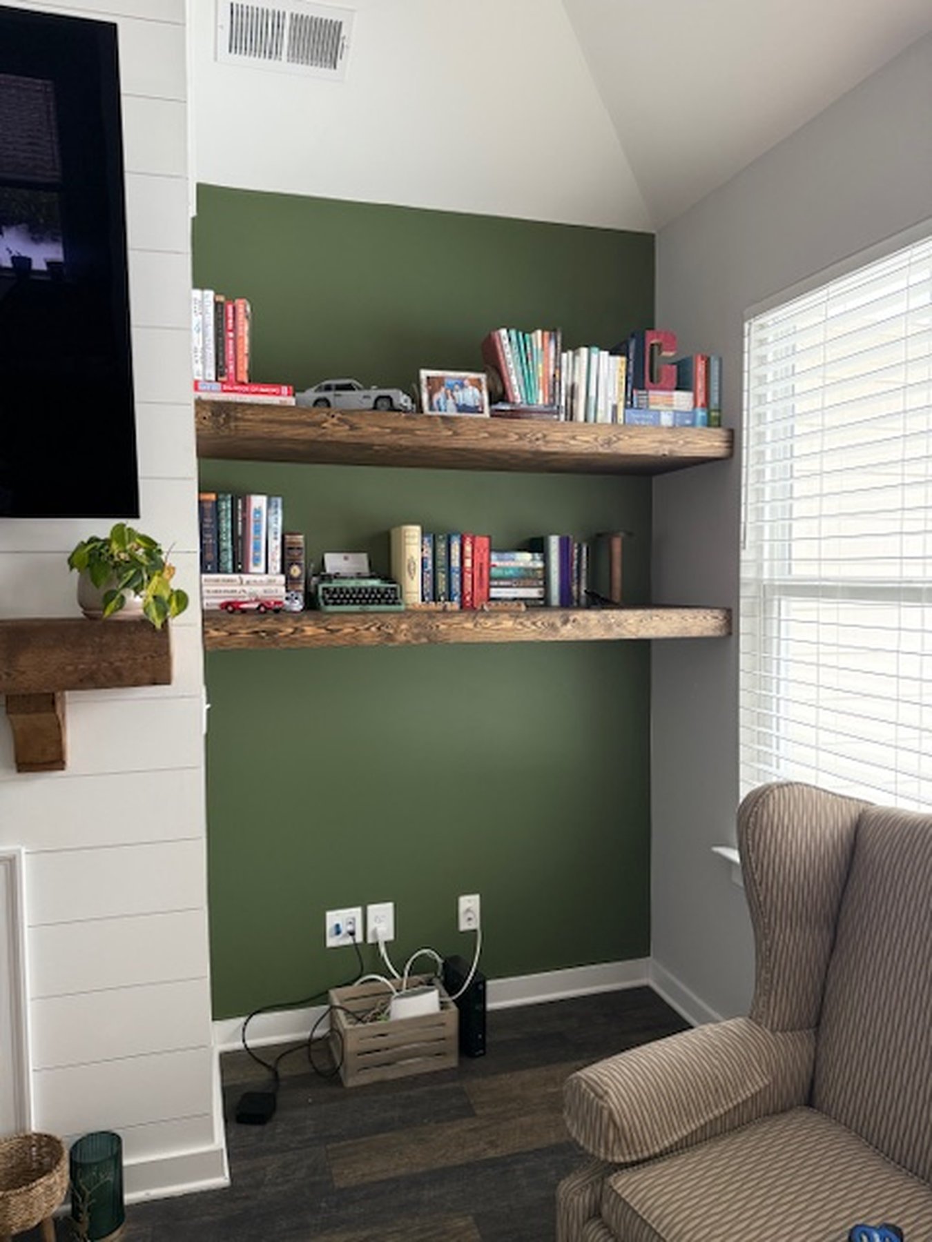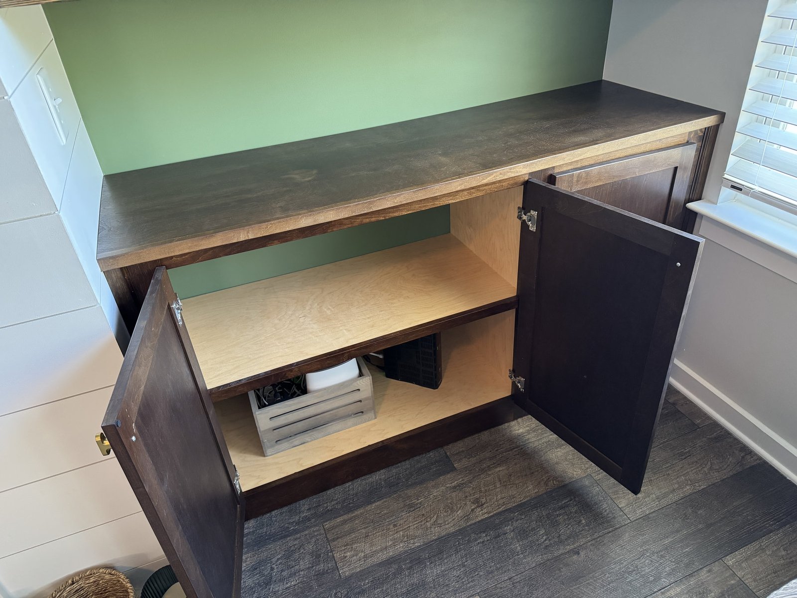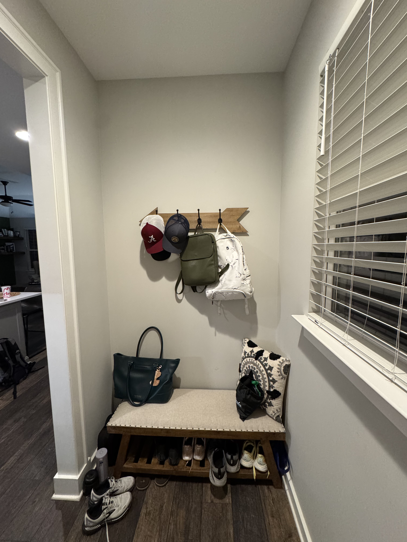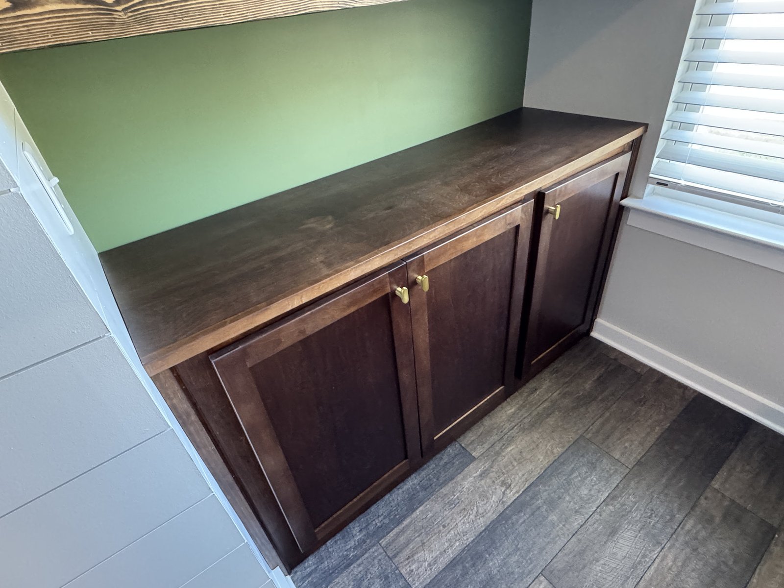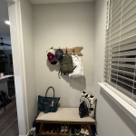 We added a cabinet under some existing shelving in the living room and a mudroom off the garage allowed for this added storage, seating and hangings with darker colors and accent stain bench seat.