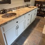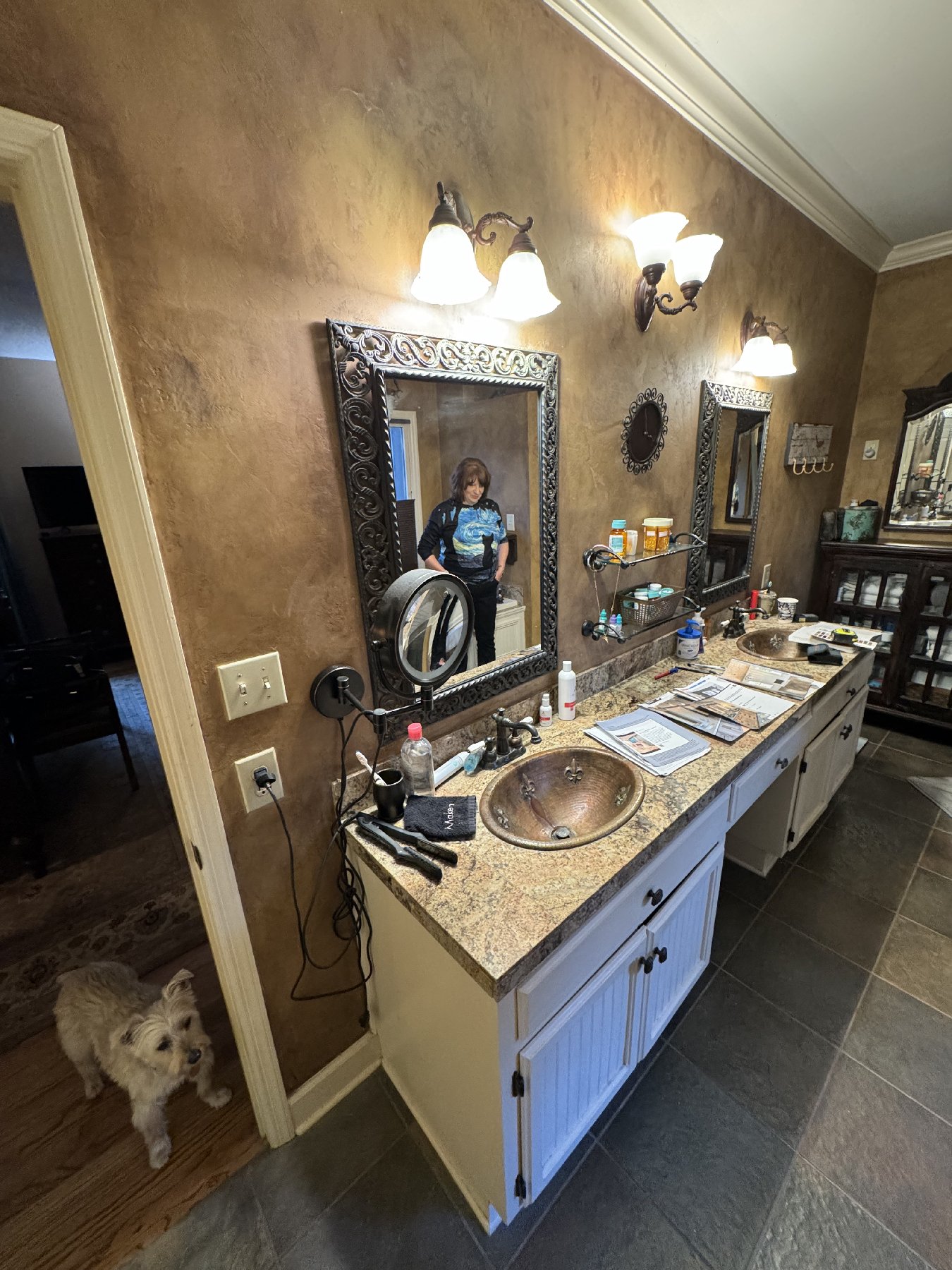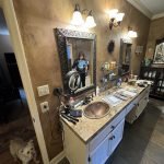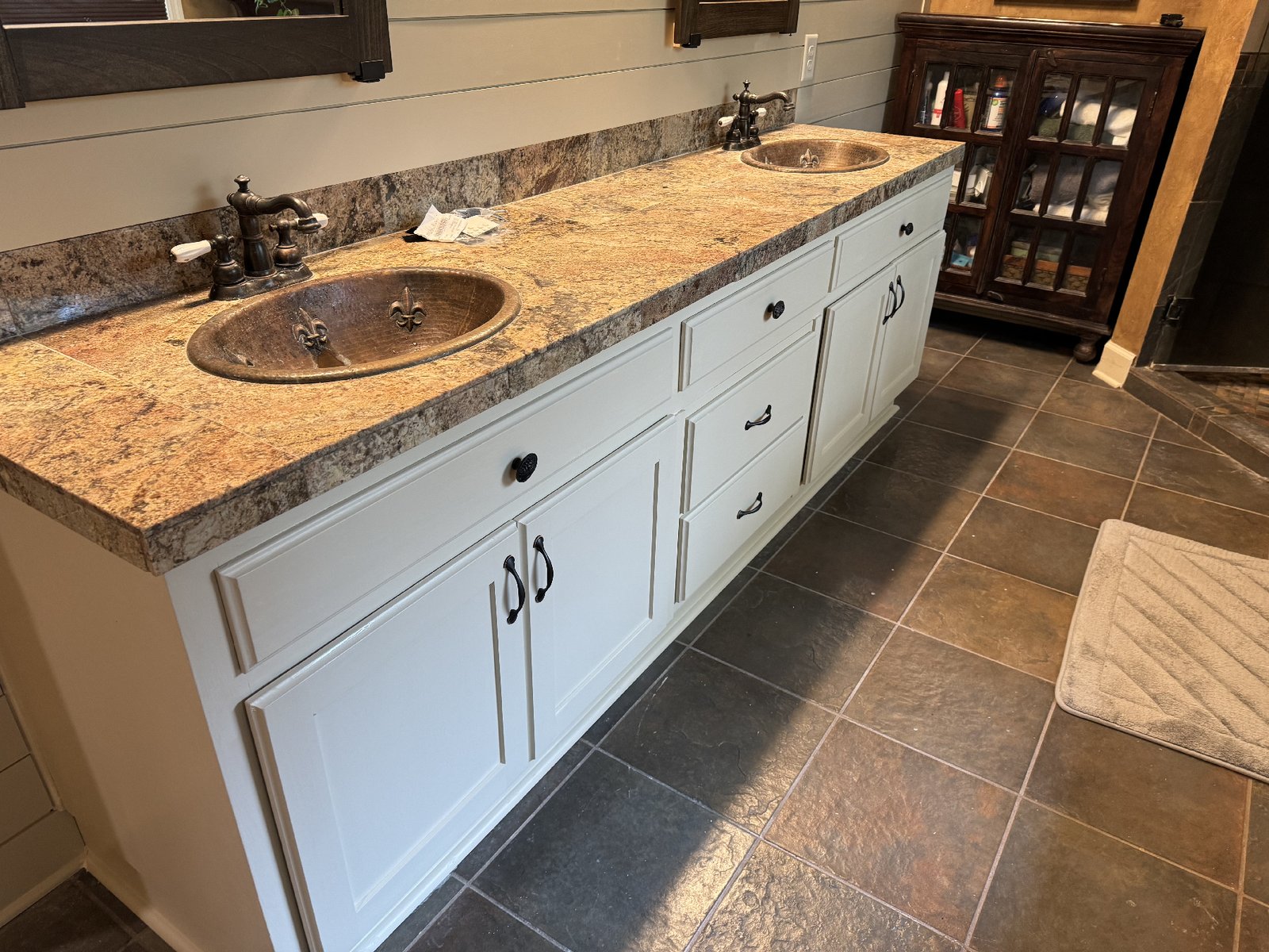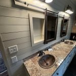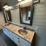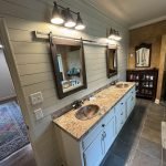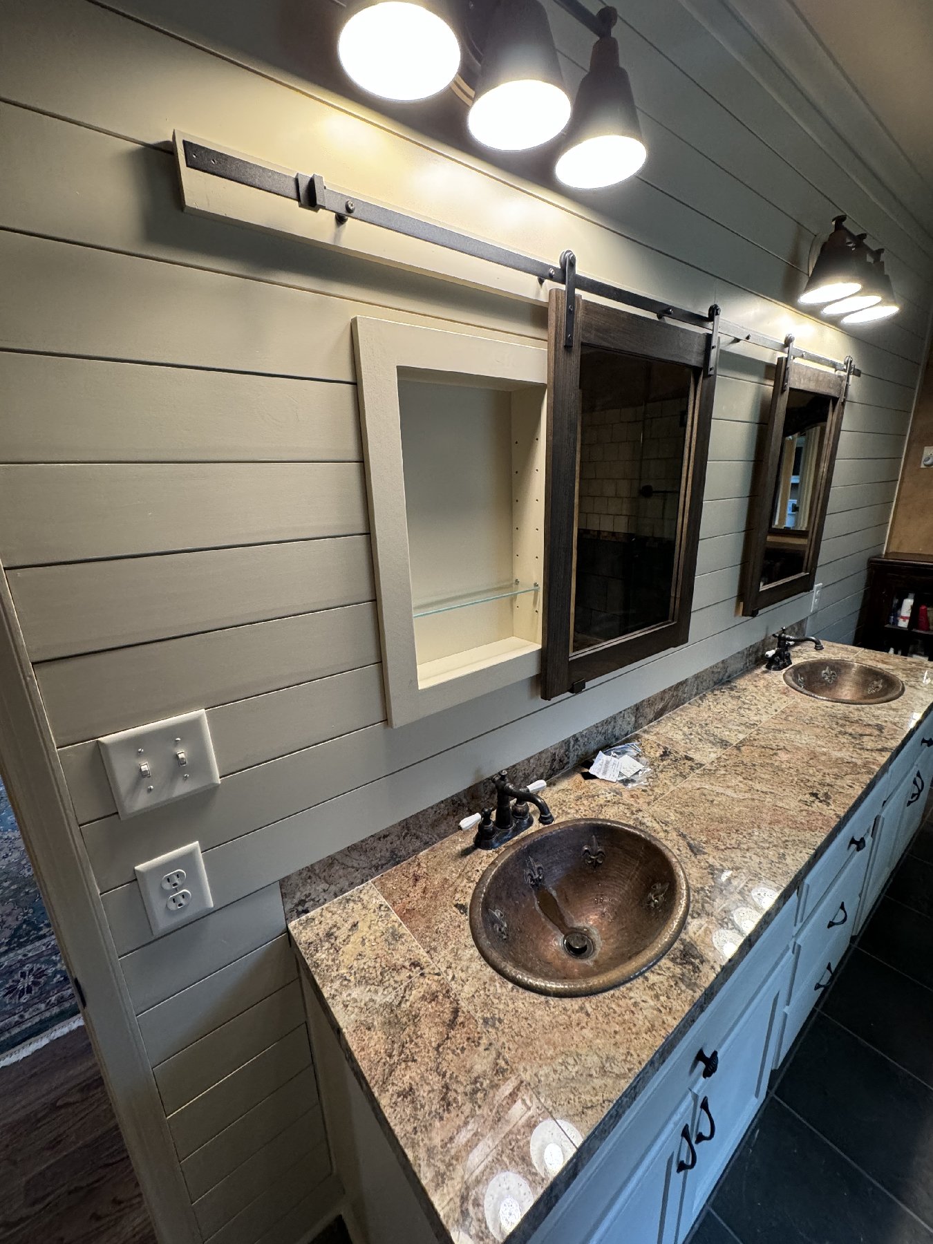 Master bath got a transformation on the wall with ship lap and new medicine cabinets with track mirrors. Also, remade the doors and added a bank of drawers for the vanity.
