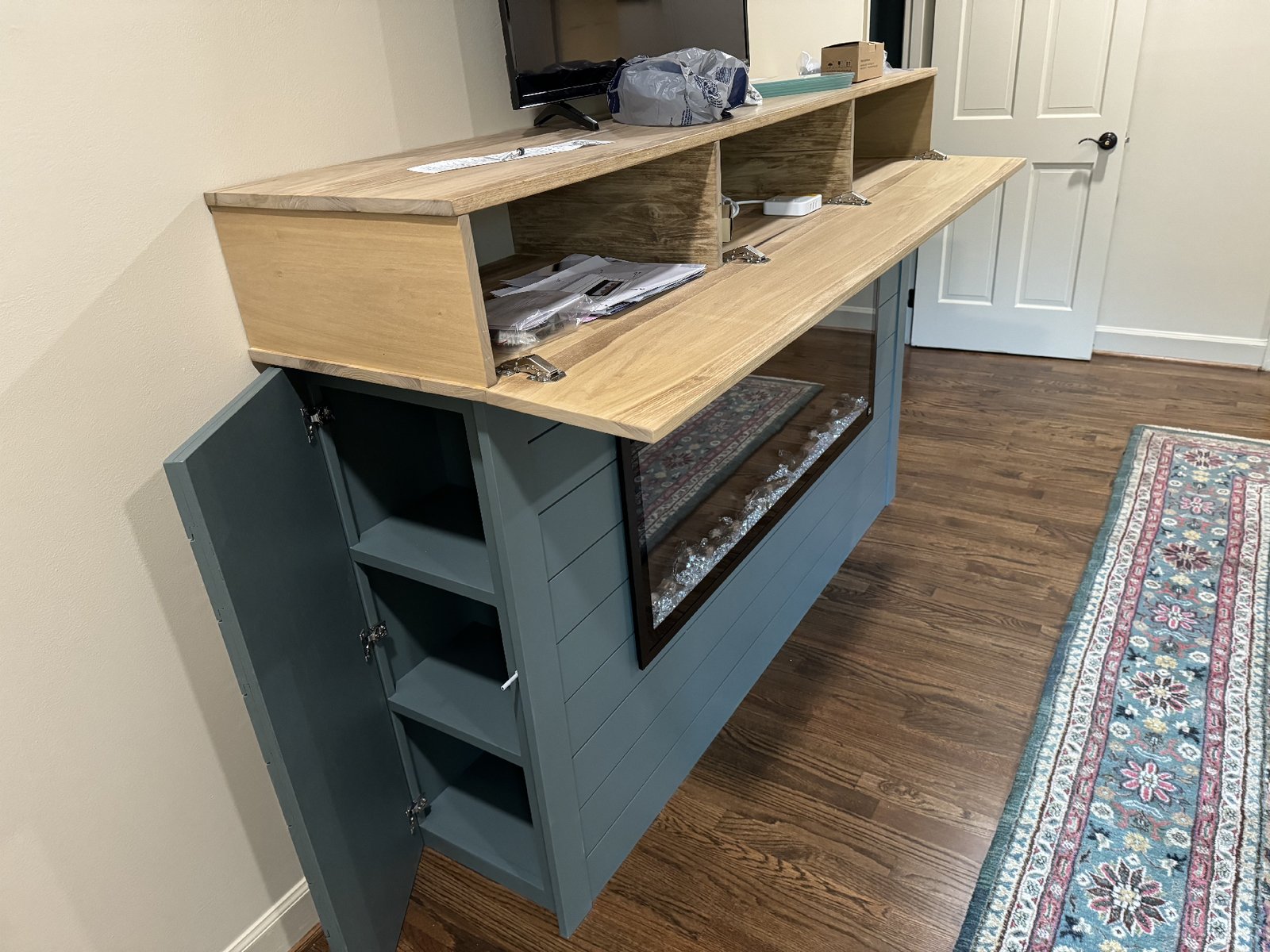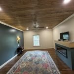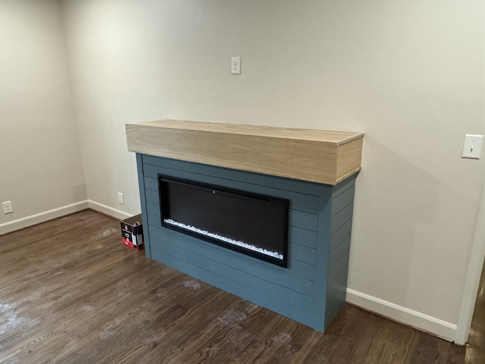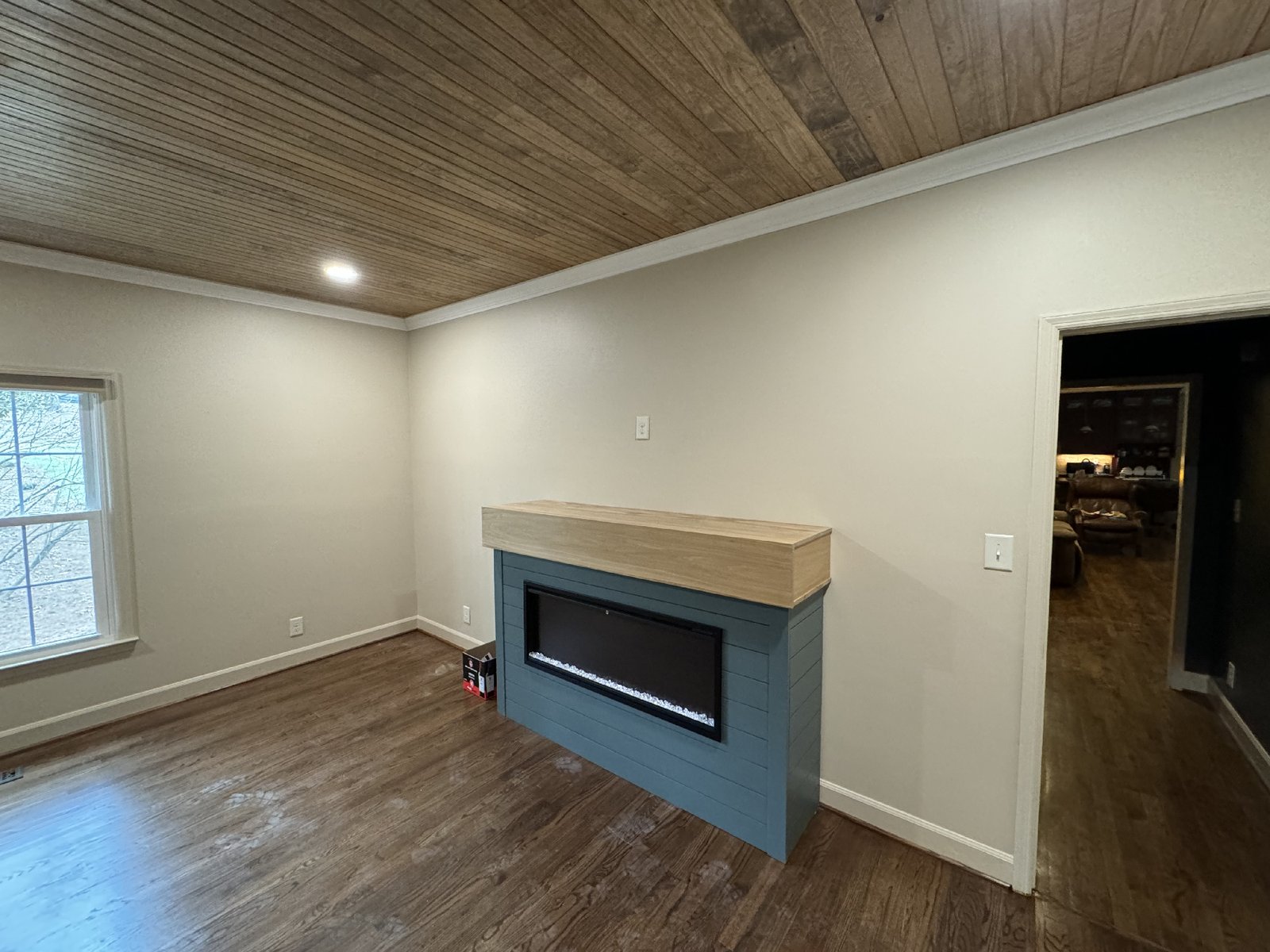 Tongue & Groove ceilings in the bedroom and hall along with crown moulding. Bedroom also installed a new fireplace with electric fire insert. Hidden storage shelves in the sides and the mantel opens up for more storage and charging station.