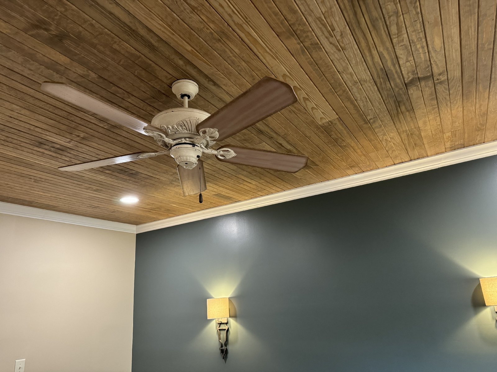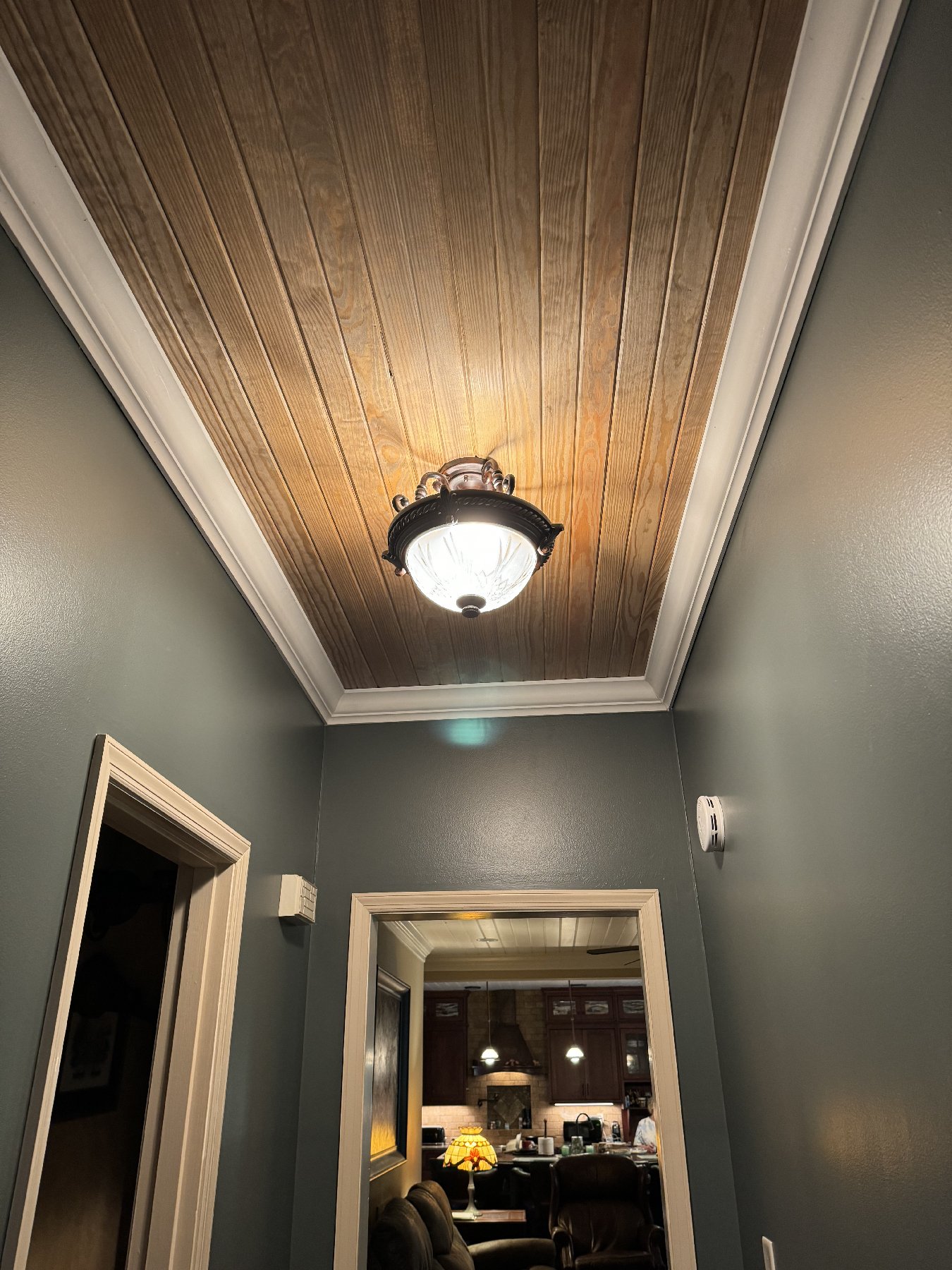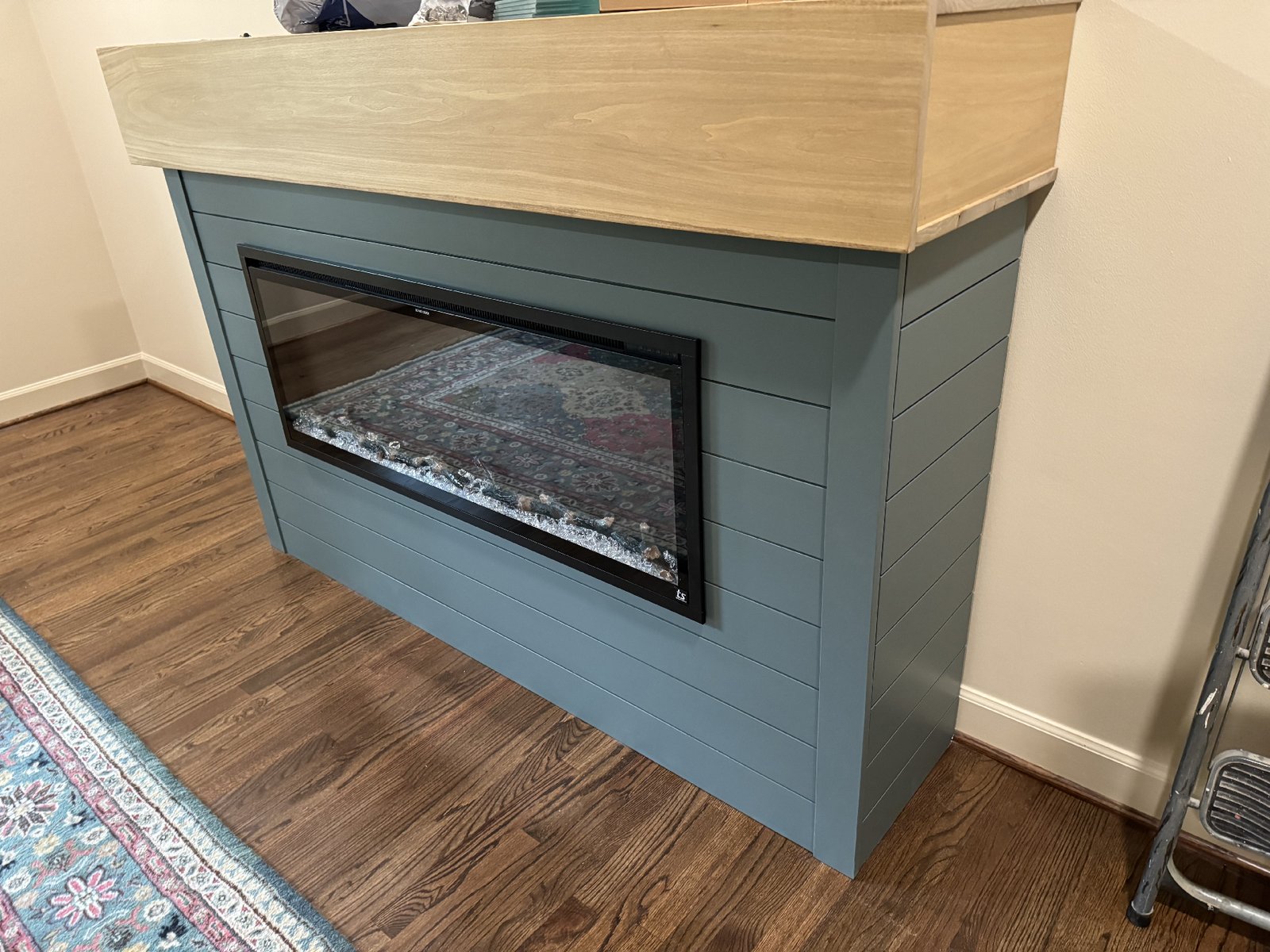 Tongue & Groove ceilings in the bedroom and hall along with crown moulding. Bedroom also installed a new fireplace with electric fire insert. Hidden storage shelves in the sides and the mantel opens up for more storage and charging station.