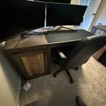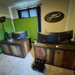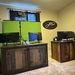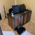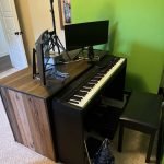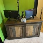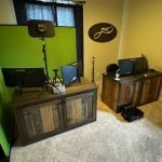 Client wanted two pieces of furniture to outfit his piano bar music studio. Cabinet for storage and also hide the cables for the monitors on top. And, a matching desk for the music tech and his computer equipment.
