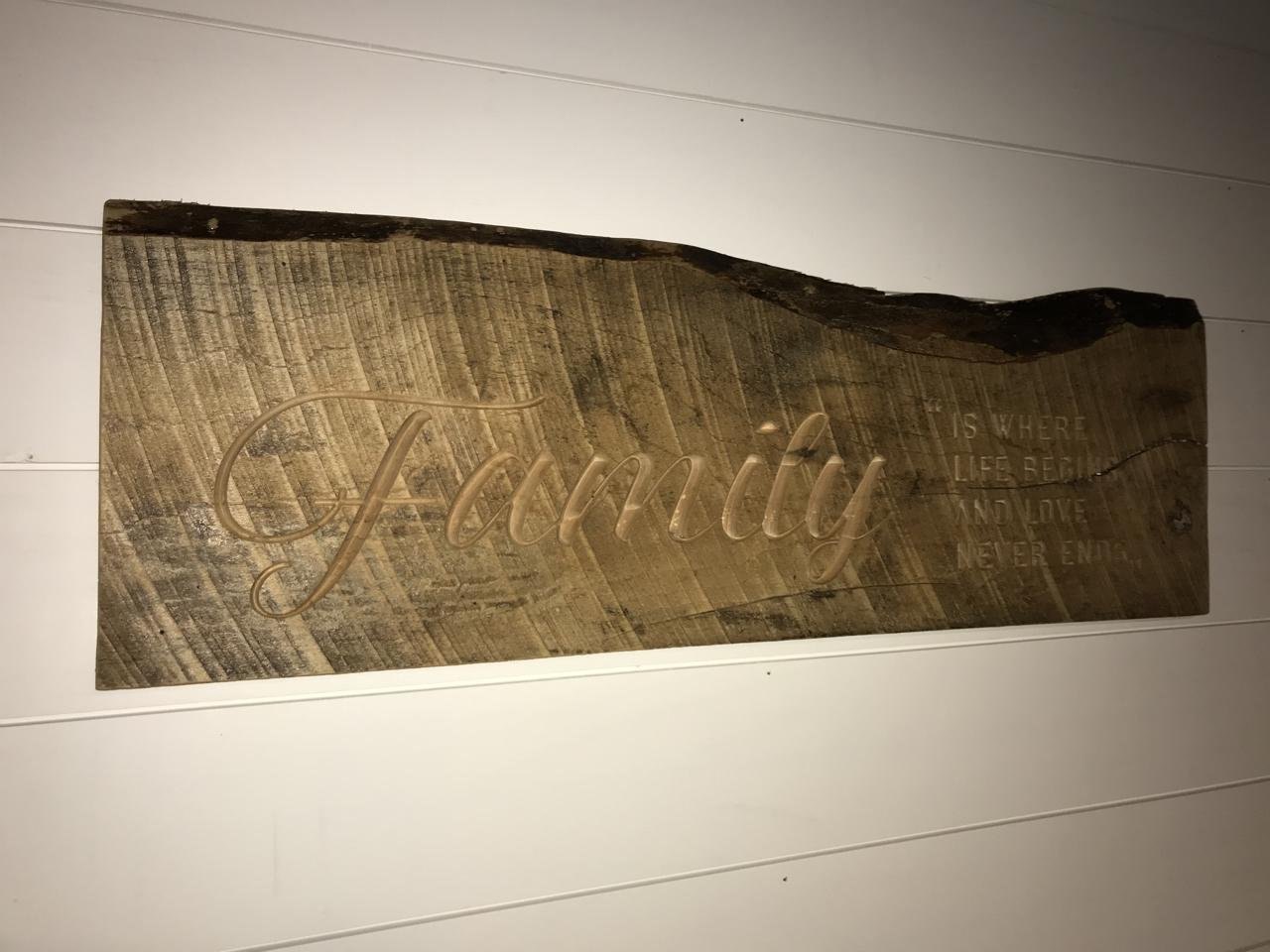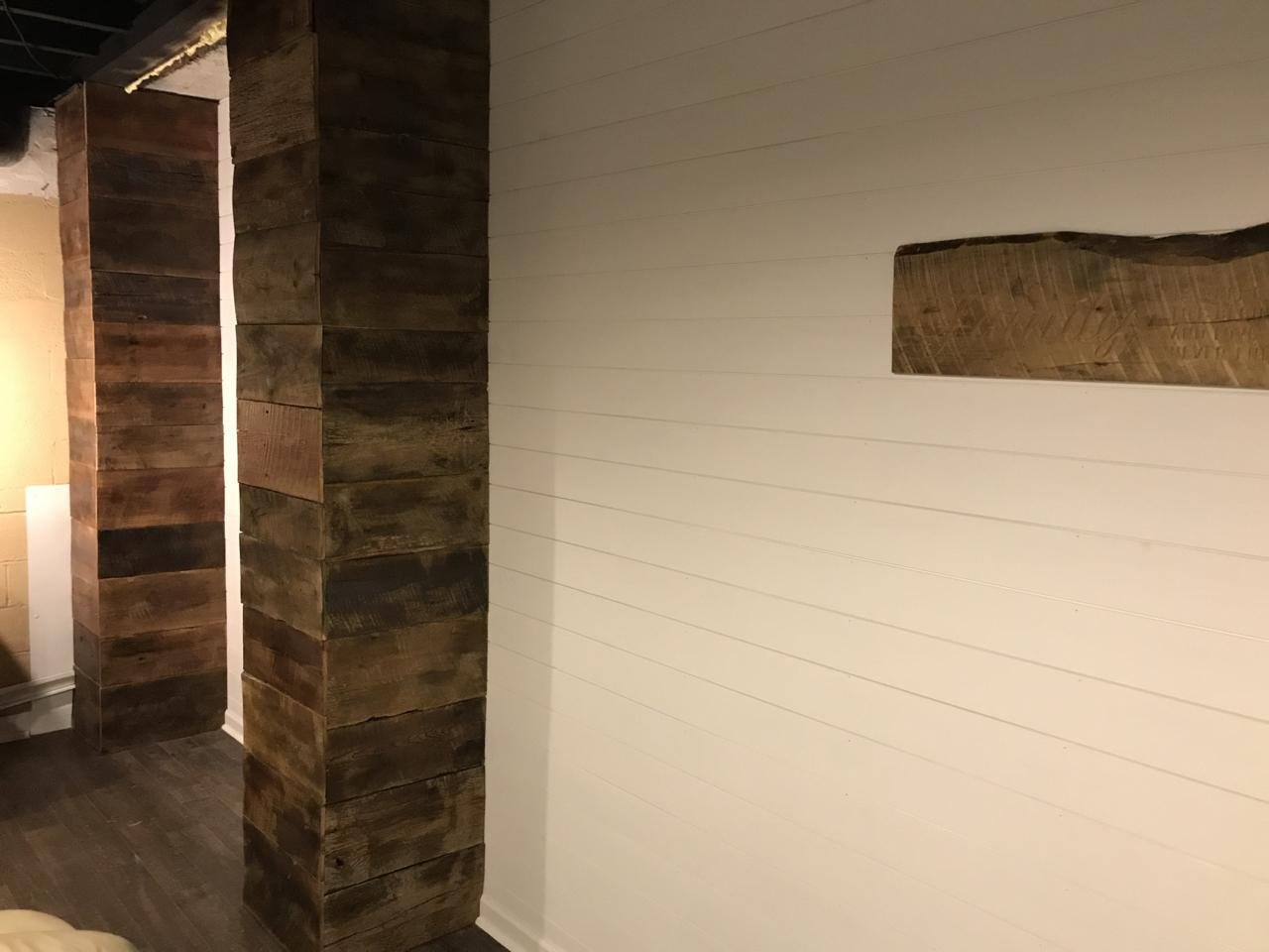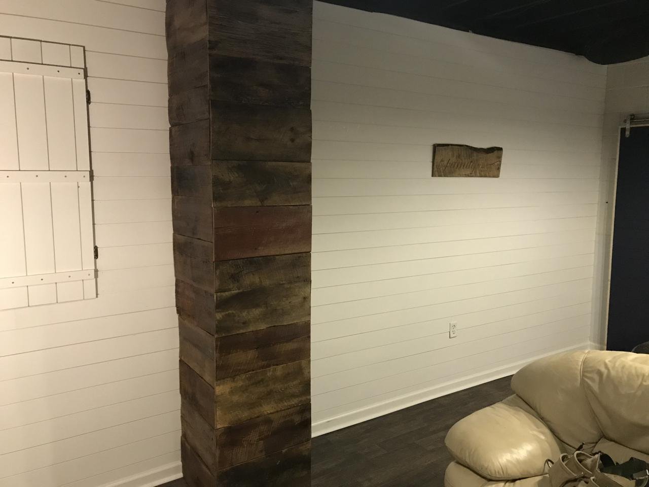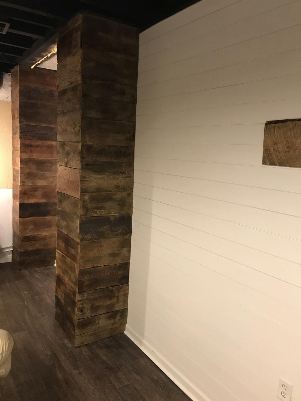 A facelift for a tired, concrete block basement wall. Now, a fresh and warm living space. Ship lap walls with 100 year old barnwood covering the columns. And, a nice little surprise… a CNC carved “Family” sign for the new space.