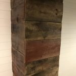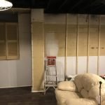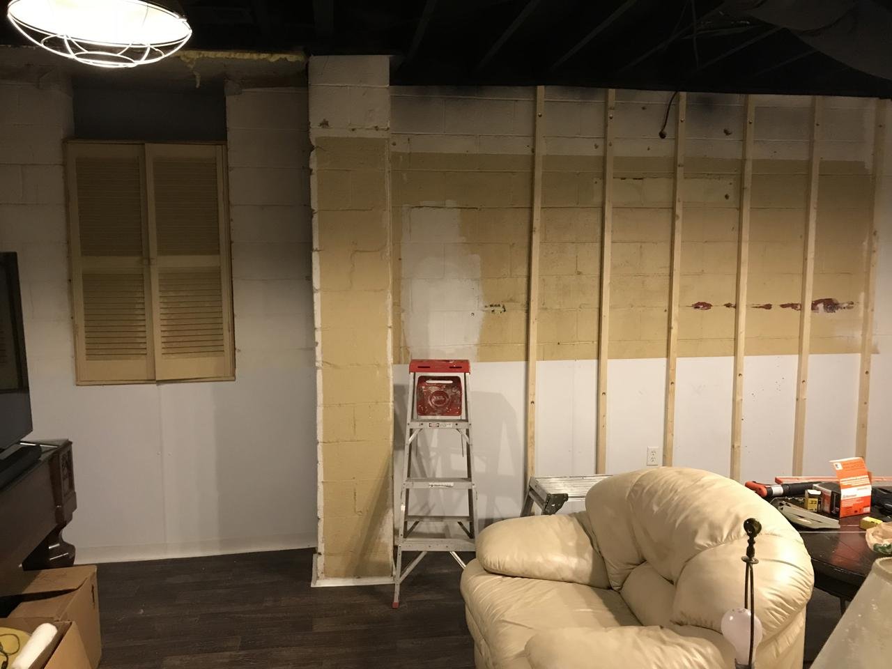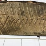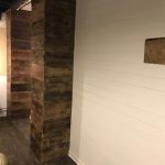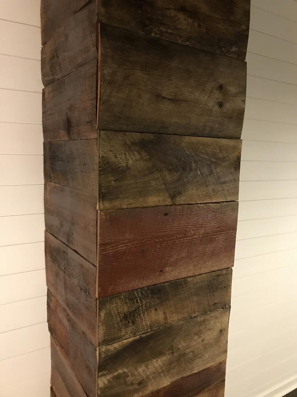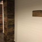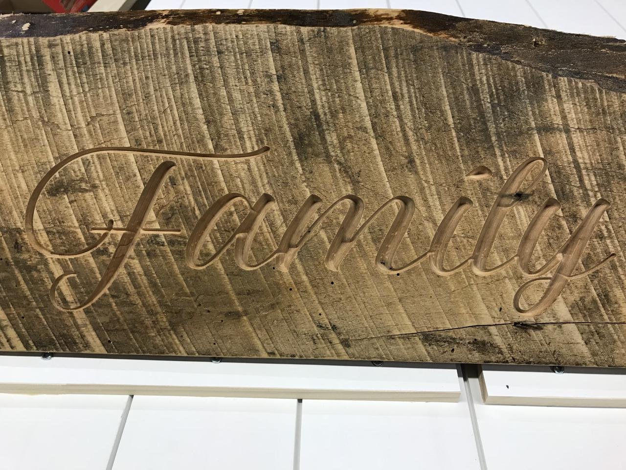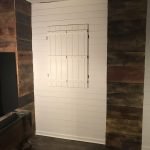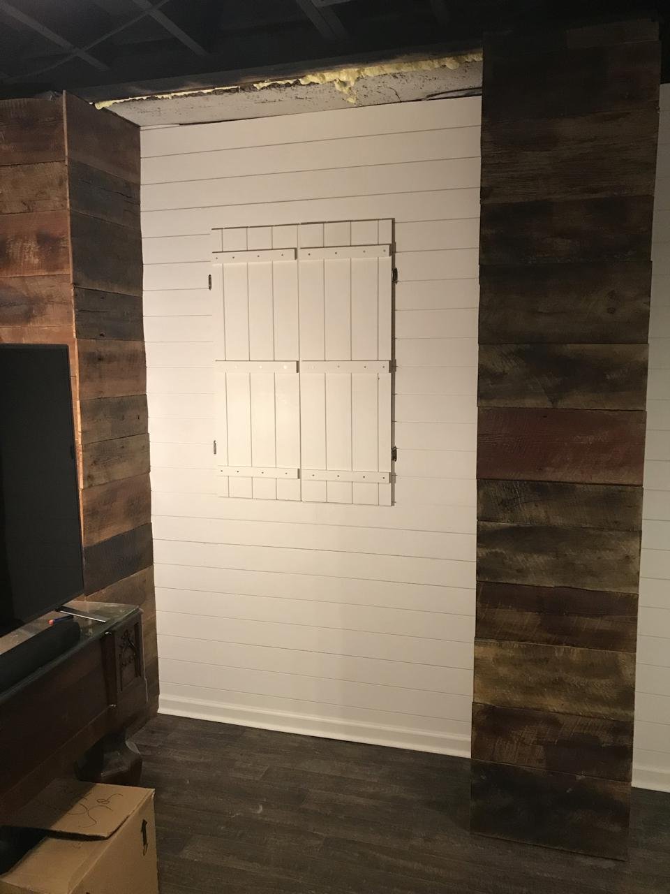 A facelift for a tired, concrete block basement wall. Now, a fresh and warm living space. Ship lap walls with 100 year old barnwood covering the columns. And, a nice little surprise… a CNC carved “Family” sign for the new space.