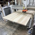 This was not an easy build (seems easy – just a table)… but this one had a lot of “one-shot” chances. The time-line left nothing for mistakes. The wood for the top had to be milled, jointed, planed, glued and sanded to create the top. This process takes a long time. After that, the “inlays” for the flag and river had to be routed into the top. (Again, NO 2nd chance here). The table is so long (over 8’) that it had to be routed in 3 sections.
