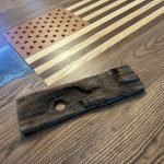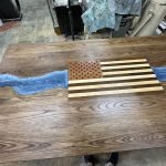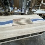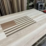 The next step, was the Flag Inlay portion. This is where the “Mighty Mo” come into the picture. The dark stripes on the flag are actual pieces of decking from the USS Missouri Battleship. My clients got some on their trip to Hawaii where the ship is on display today. The pieces had to be cut and planed and glued into the cutout along with some other pieces of ash and mahogany to form the flag.