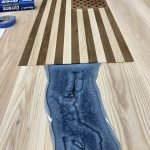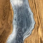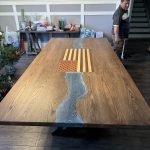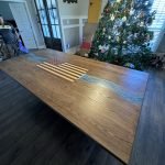 The next step was to pour the epoxy for the “River”. (Another no do-over – as if this is not done correctly – the entire build is toast). Epoxy takes 3-4 days to fully cure, so I was on the hurry up and wait now. Then final sanding for over 8 hours through many grits to get it smooth and ready for the final color. Stained, oiled and many coats of topcoat to finish this project ready for delivery to the family.
