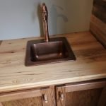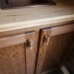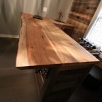 “L-Shaped” wine bar, white oak stained cabinets with a hickory live-edge slab top. The front overhangs with some stools and capped off with some reclaimed barnwood and stylish brackets.