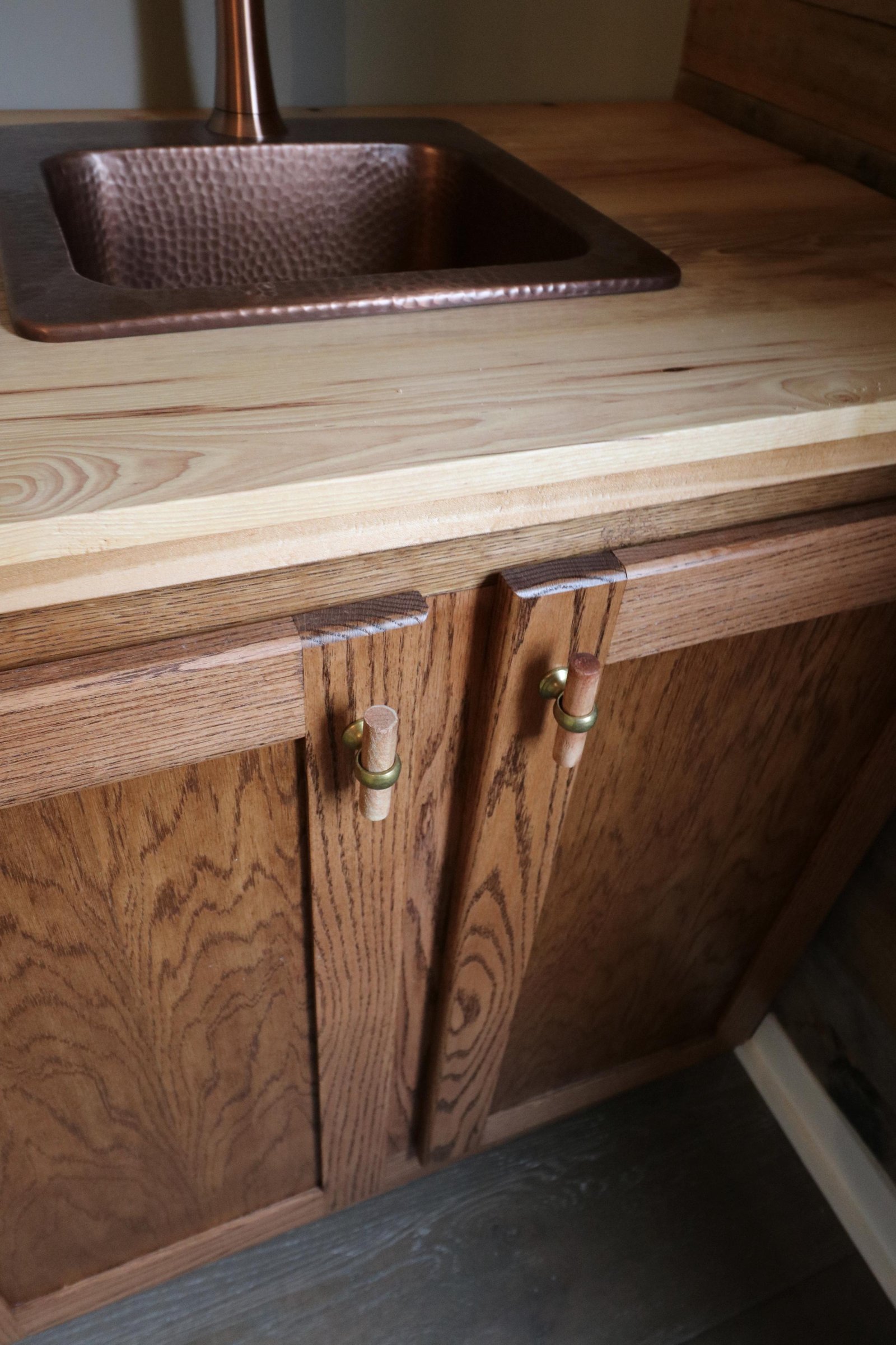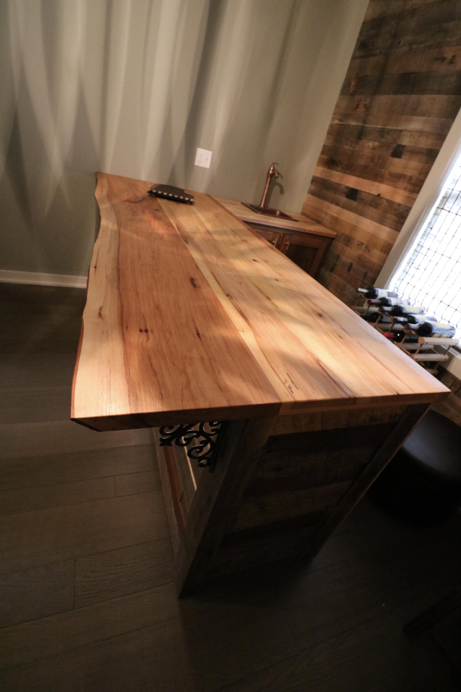 “L-Shaped” wine bar, white oak stained cabinets with a hickory live-edge slab top. The front overhangs with some stools and capped off with some reclaimed barnwood and stylish brackets.